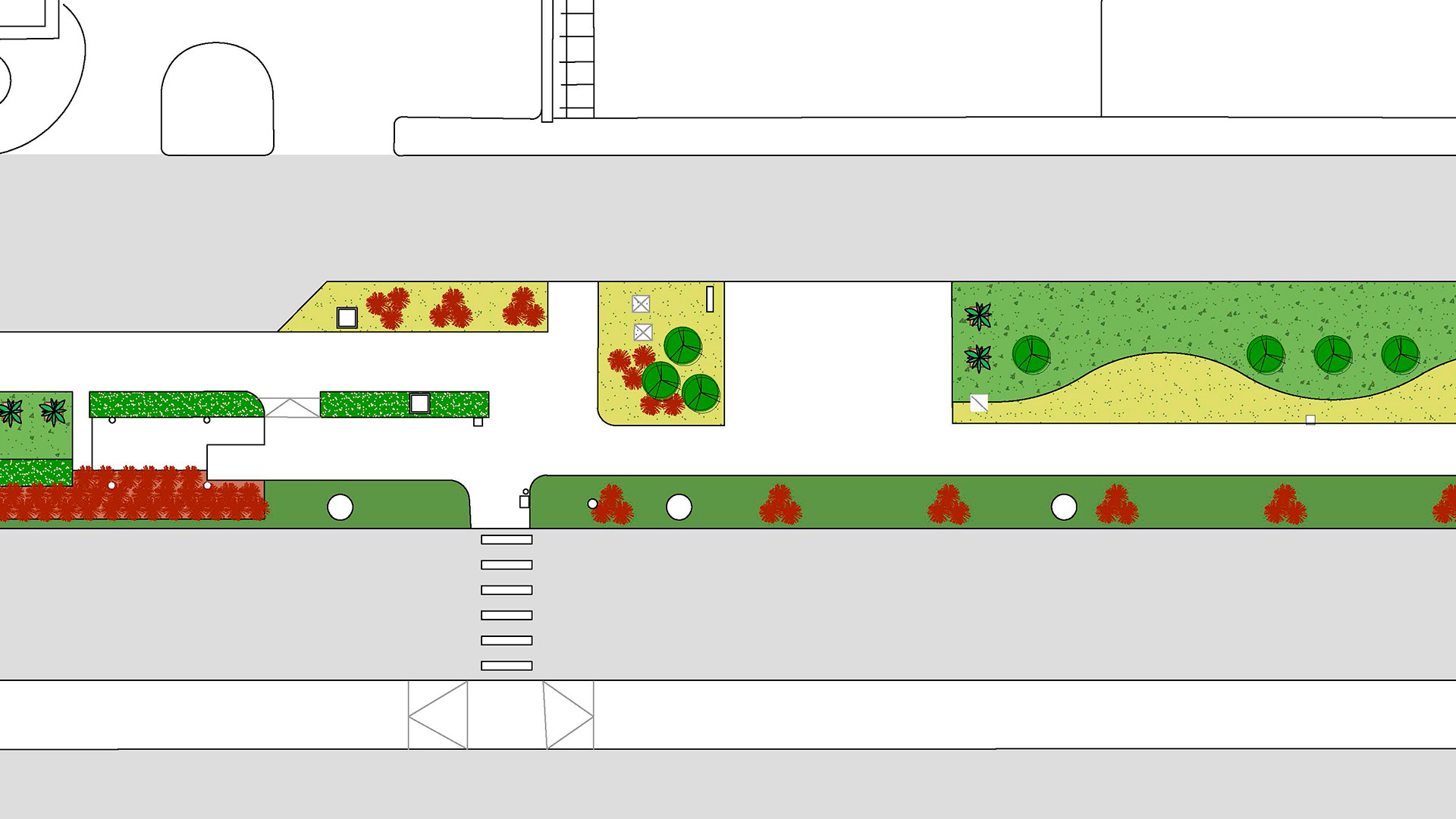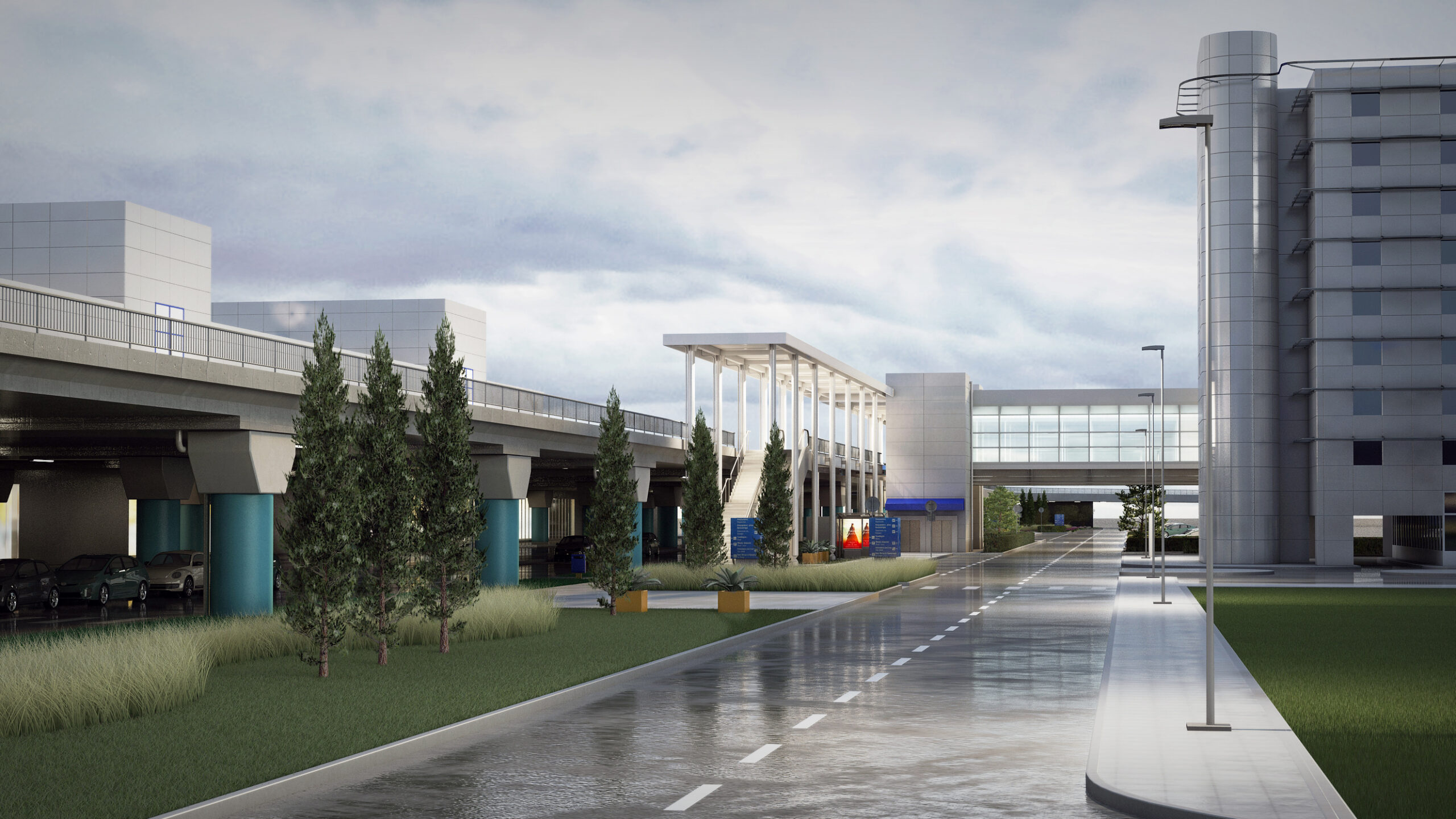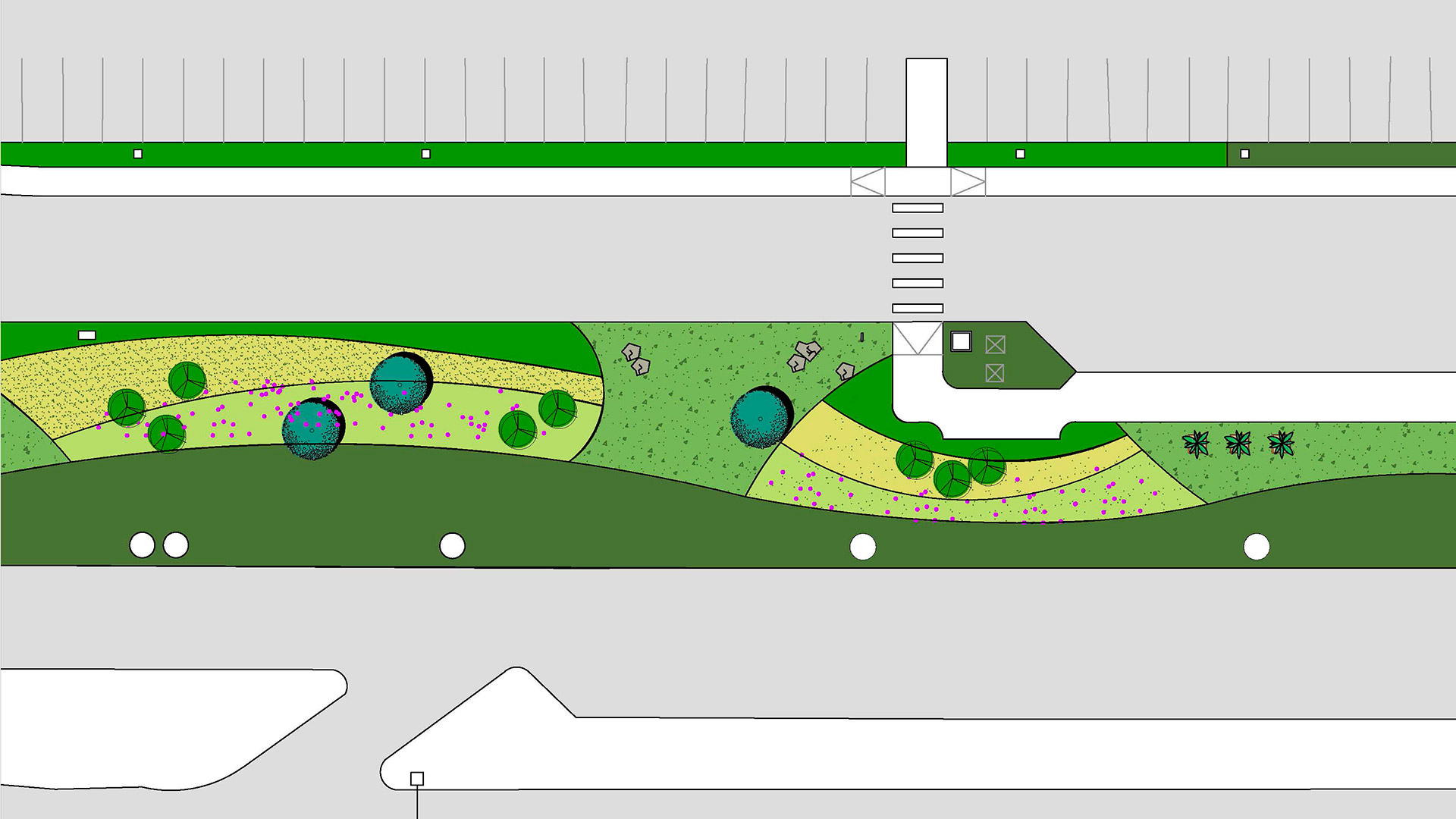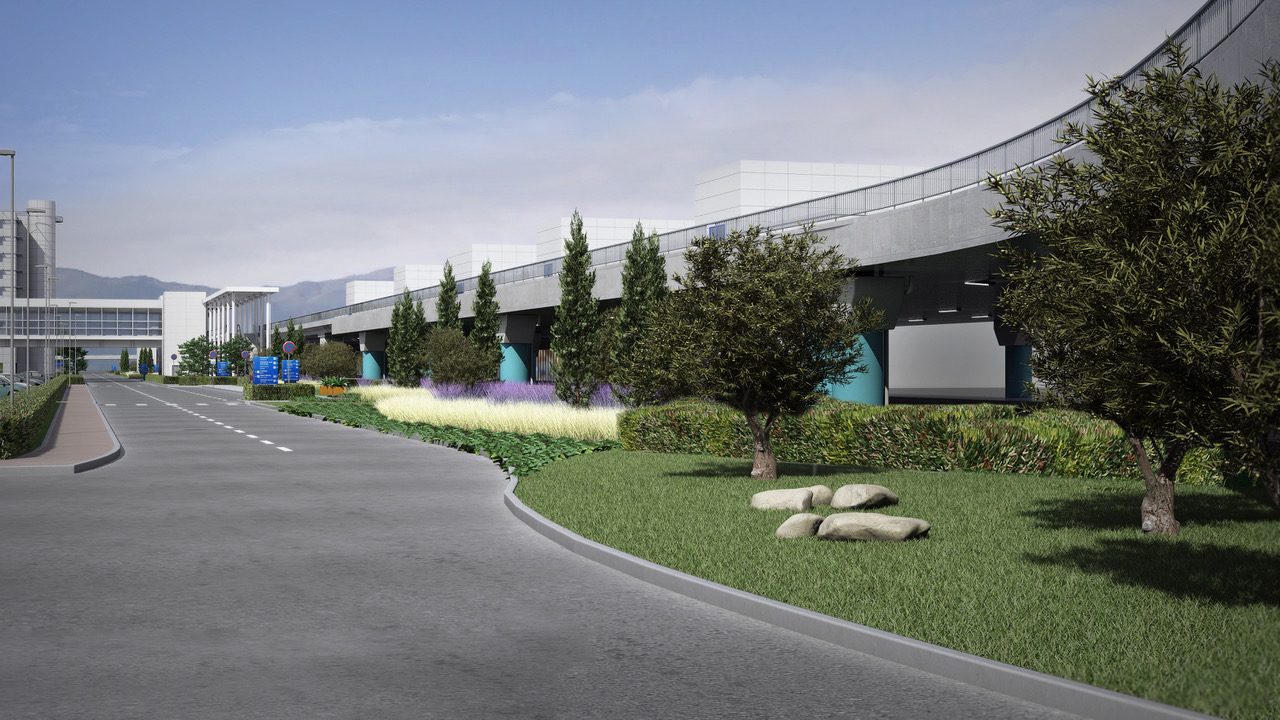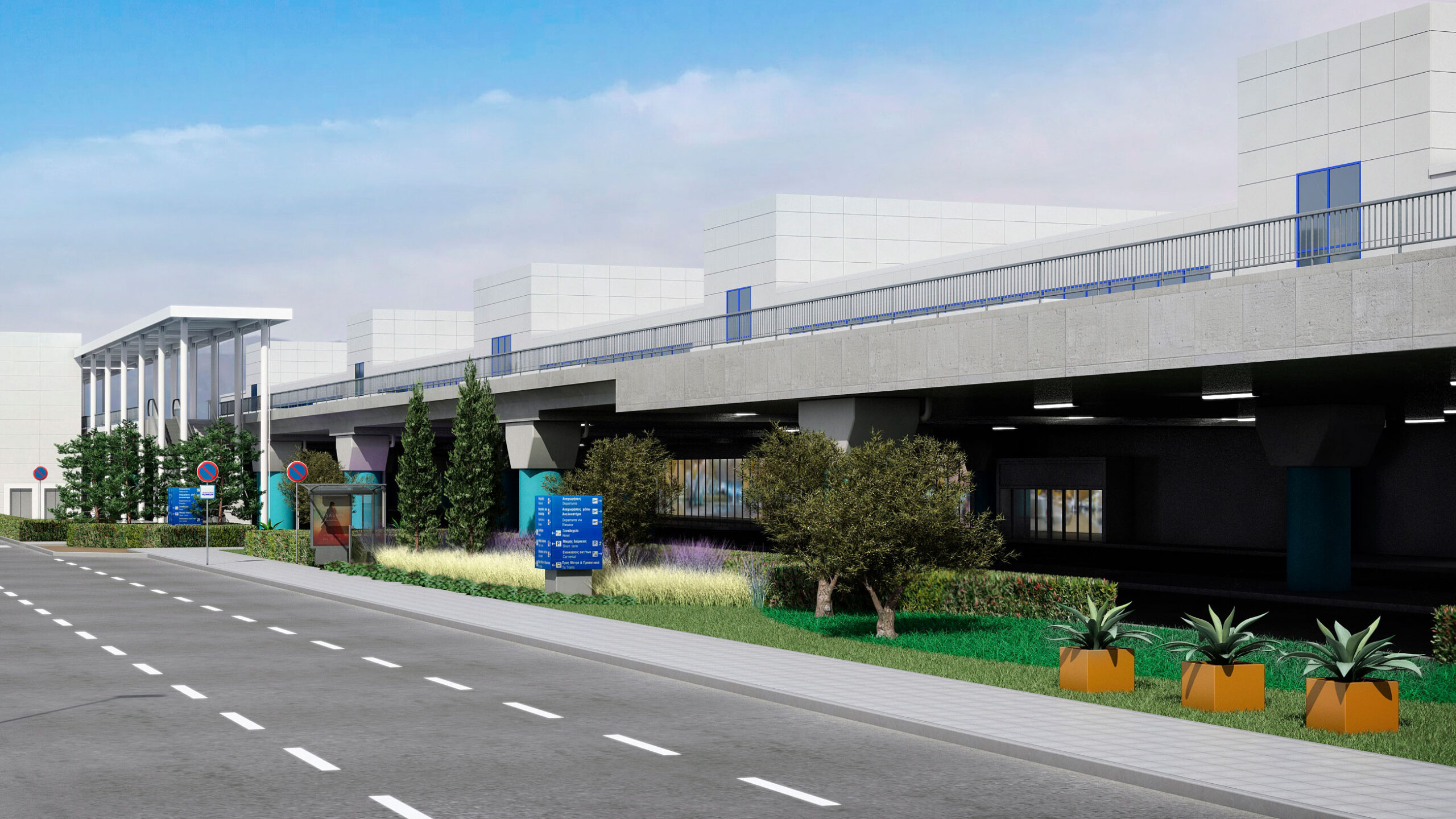 Landscape architecture proposal for the planted areas outside the Μain Τerminal building of the Eleftherios Venizelos Airport. The aim of our design was to showcase the diversity of the Greek natural landscape. Different landscape typologies -including rocks and maquis, both typical of the Mediterranean countryside, as well as elevated planted areas reminiscent of the Greek hillsides- are used in an aesthetically minimal way. Cypress and olive trees are harmoniously combined, with the geometric precision of the olive trees seamlessly integrating with the free-flowing lines of the natural environment. A long, partially hidden strip of red light runs throughout the planted areas, evoking the spontaneity and vividness of the Greek spirit.