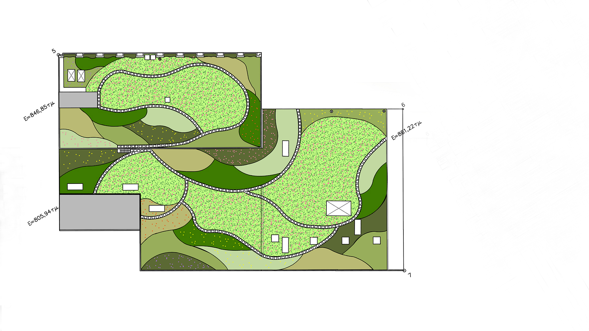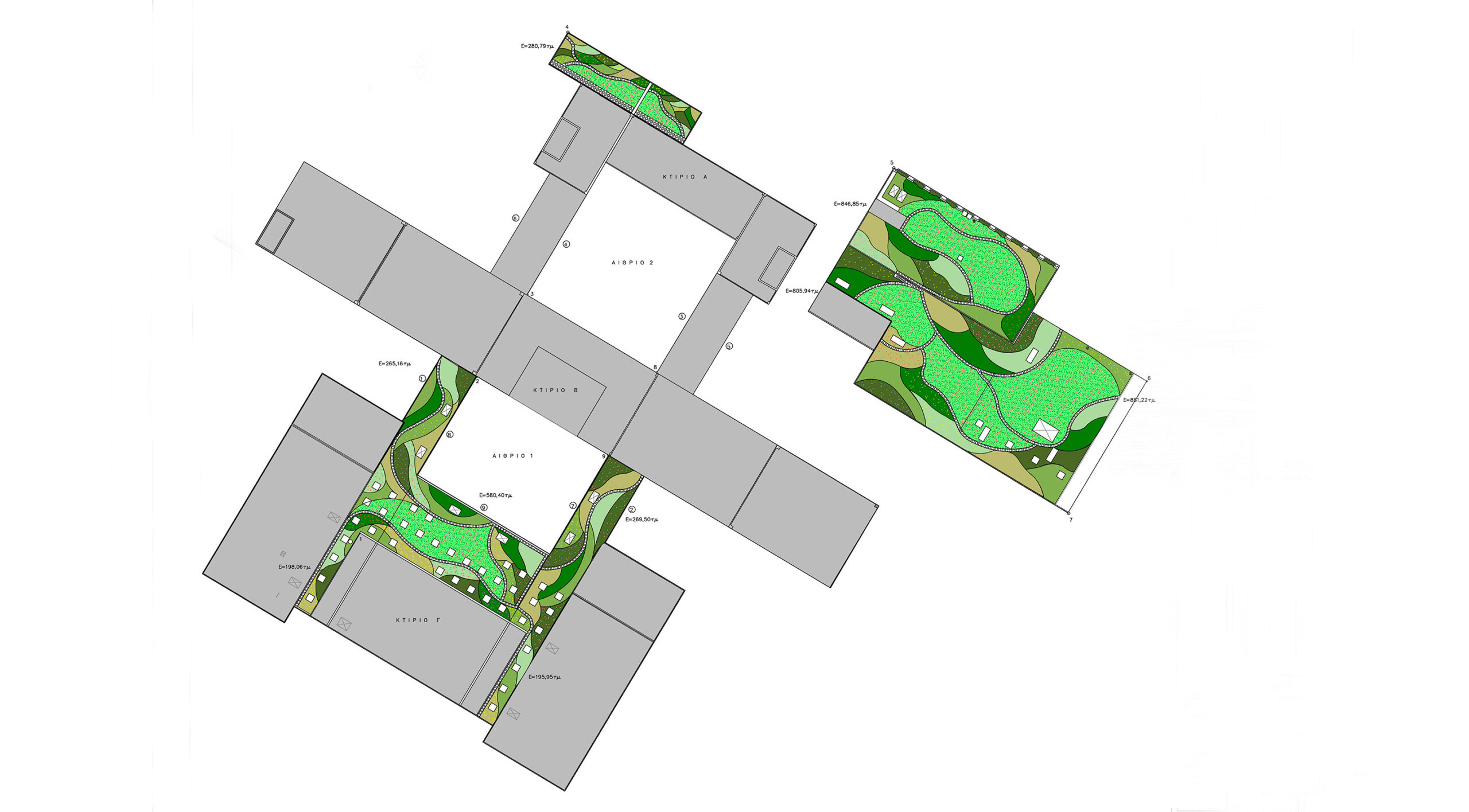 Part of a large-scale renovation project at the Technical University of Piraeus, this bioclimatic design aims to improve microclimatic conditions in the campus area by installing green roofs on three buildings: Building C, the campus kitchen, and a smaller unit opposite the Administration building. Clusters of low-growing herbaceous vegetation arranged in organic patterns are intersected by stone pathways for easier maintenance. We selected mostly native Mediterranean plant species that are highly resilient to strong winds and high temperatures and require little irrigation and maintenance. Our design is fully compliant to the Green Roof Guidelines approved by the Geotechnical Chamber of Greece.