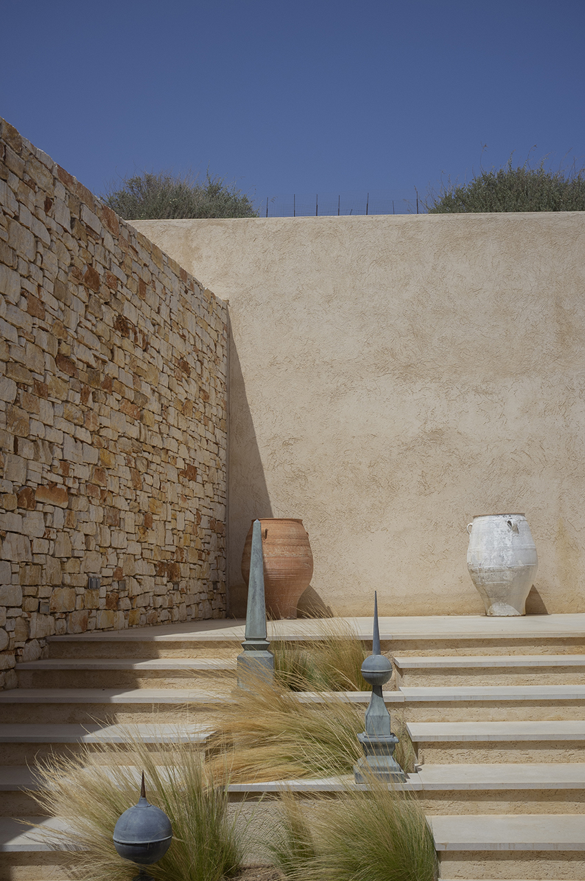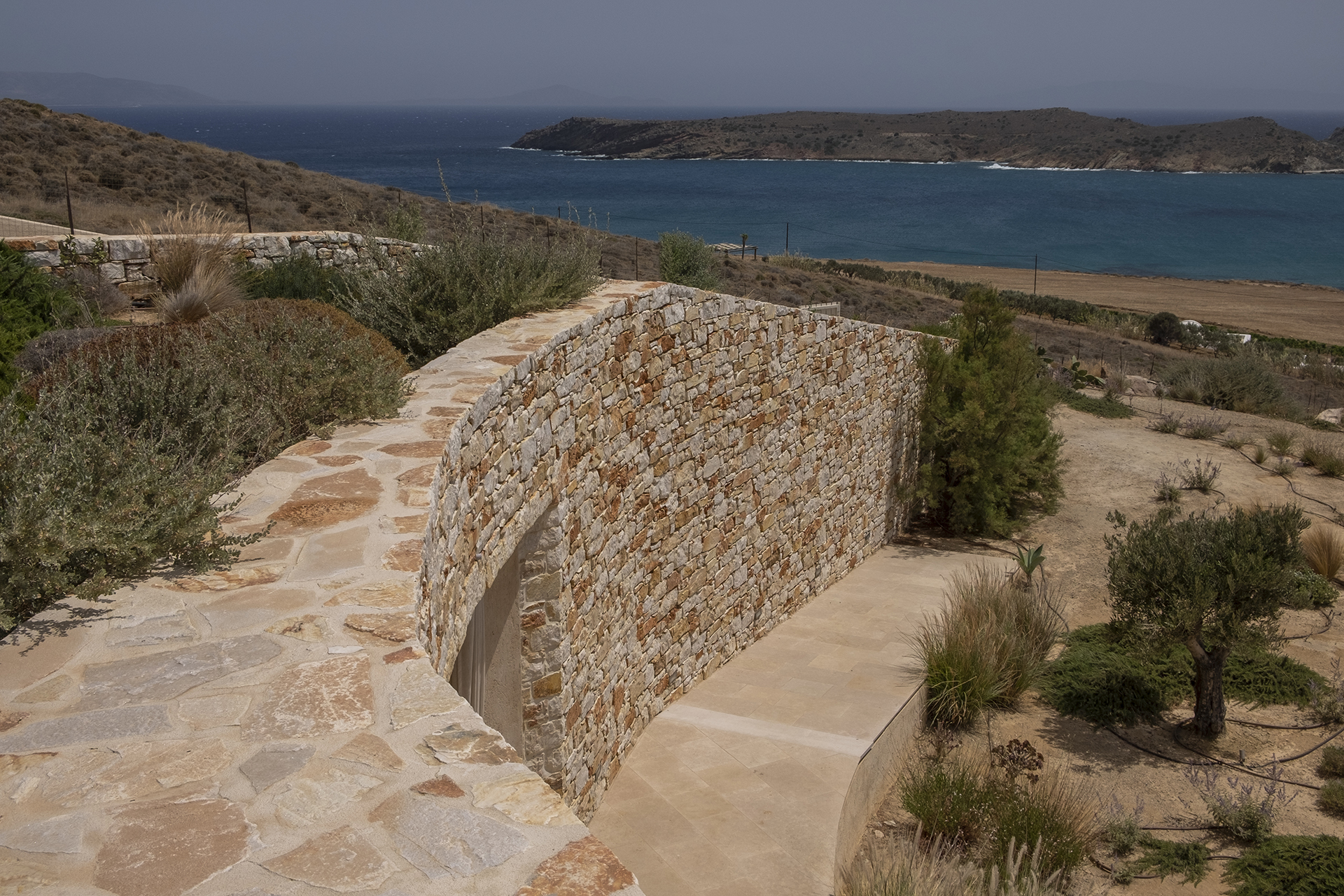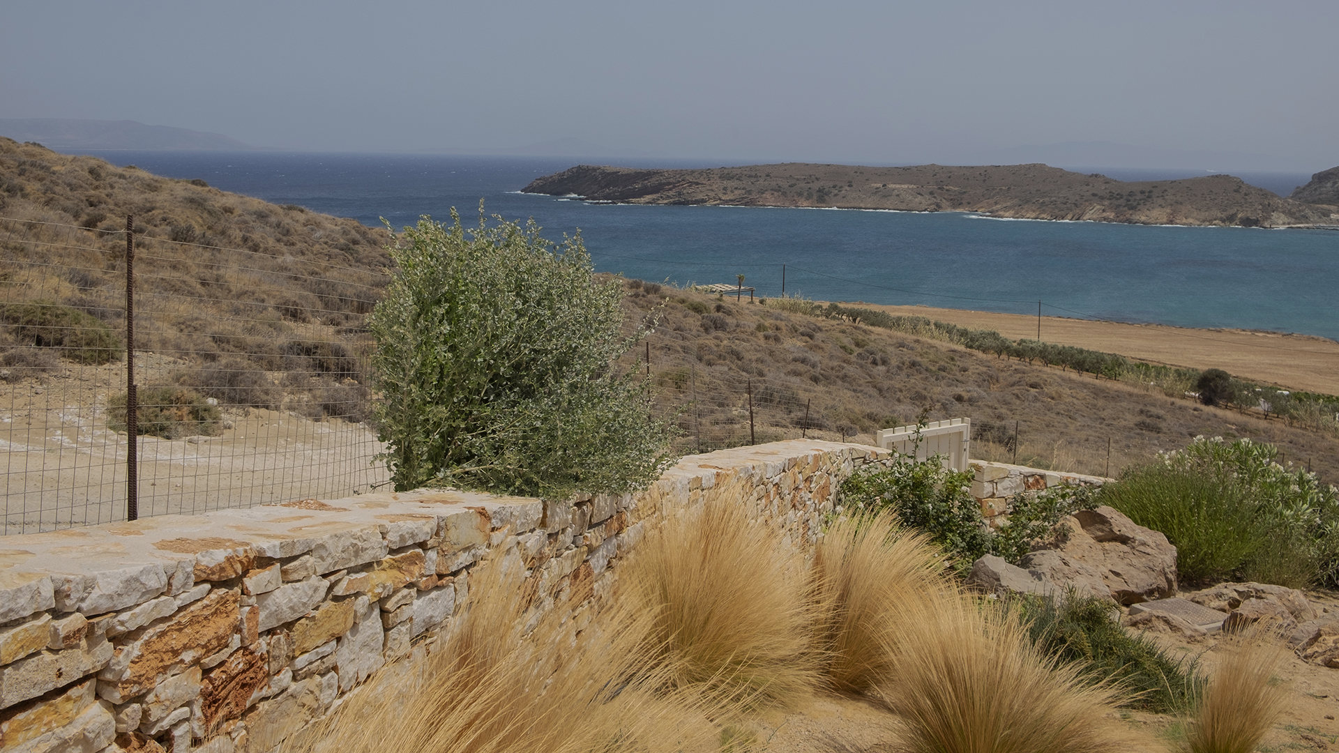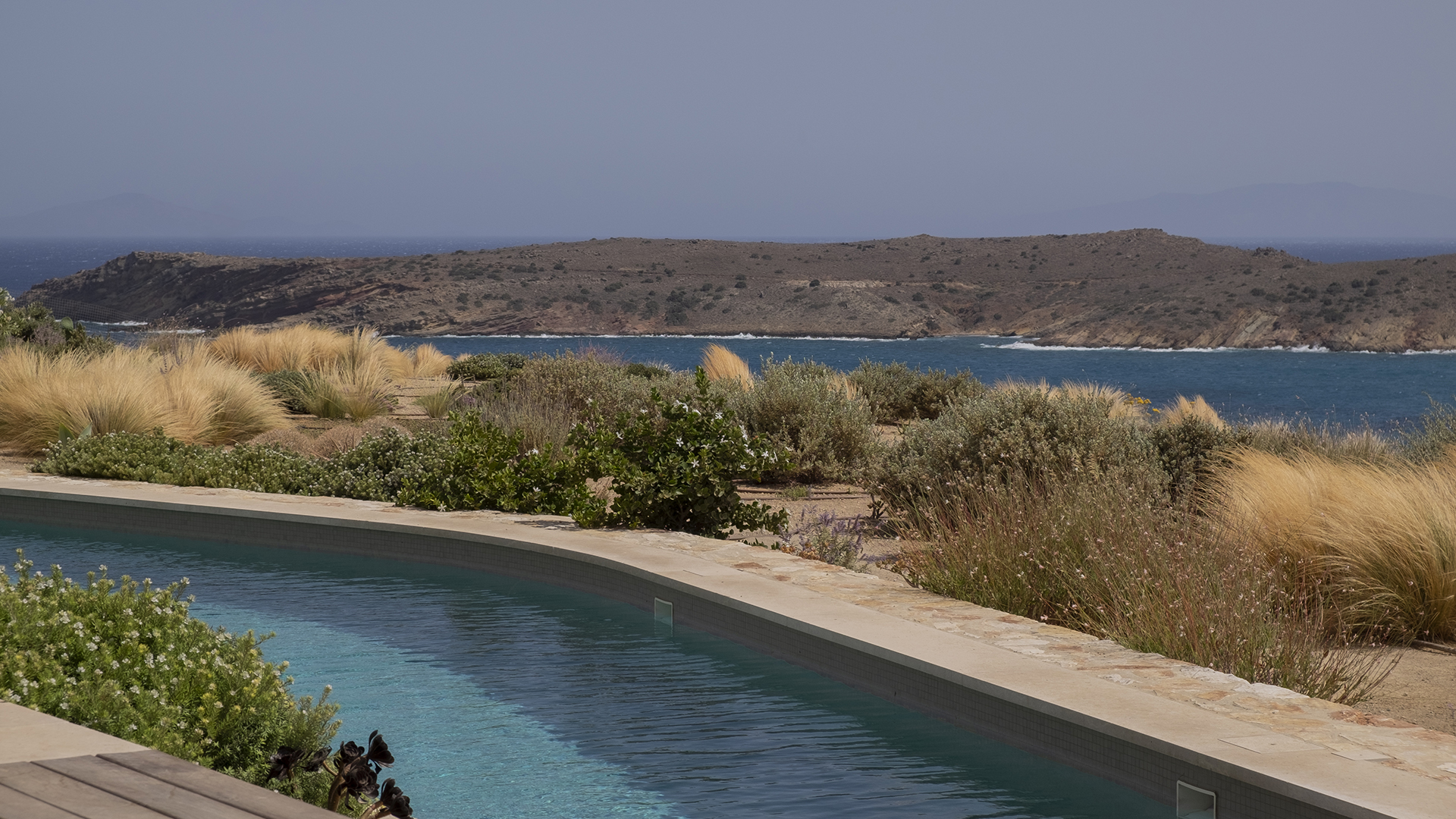 Our goal was to create a garden that embraces the site’s natural topography and panoramic sea views. Set behind a large olive grove, it features clusters of native, drought-tolerant plants that are well-adapted to Paros’ climatic conditions. A key design element is the planted strips – integrated into the outdoor stairs of the house – where Stipa tenuissima grasses add texture and a sense of movement, while also blending with the palette of hardscape materials. Green roofs planted with low Mediterranean aromatics, perennials and grasses help to further integrate the residence into the natural landscape of Molos and improve the microclimatic conditions of the house.