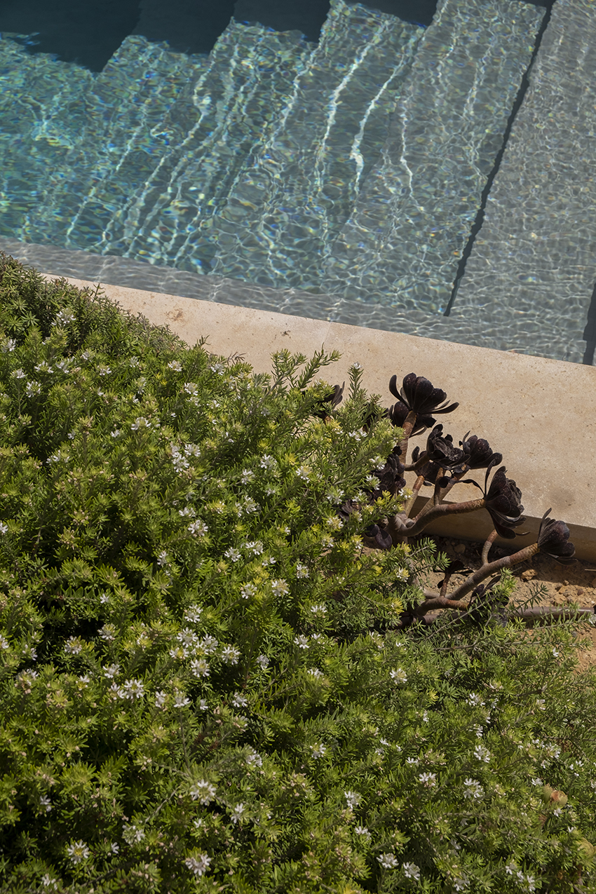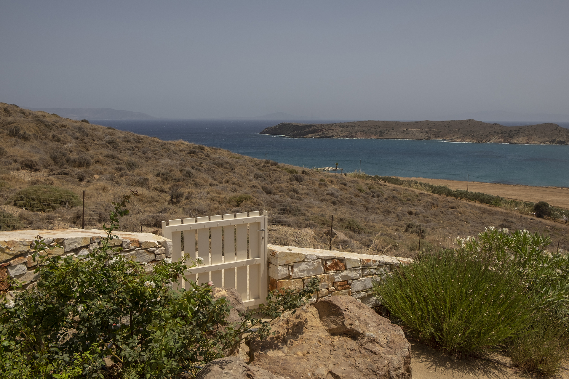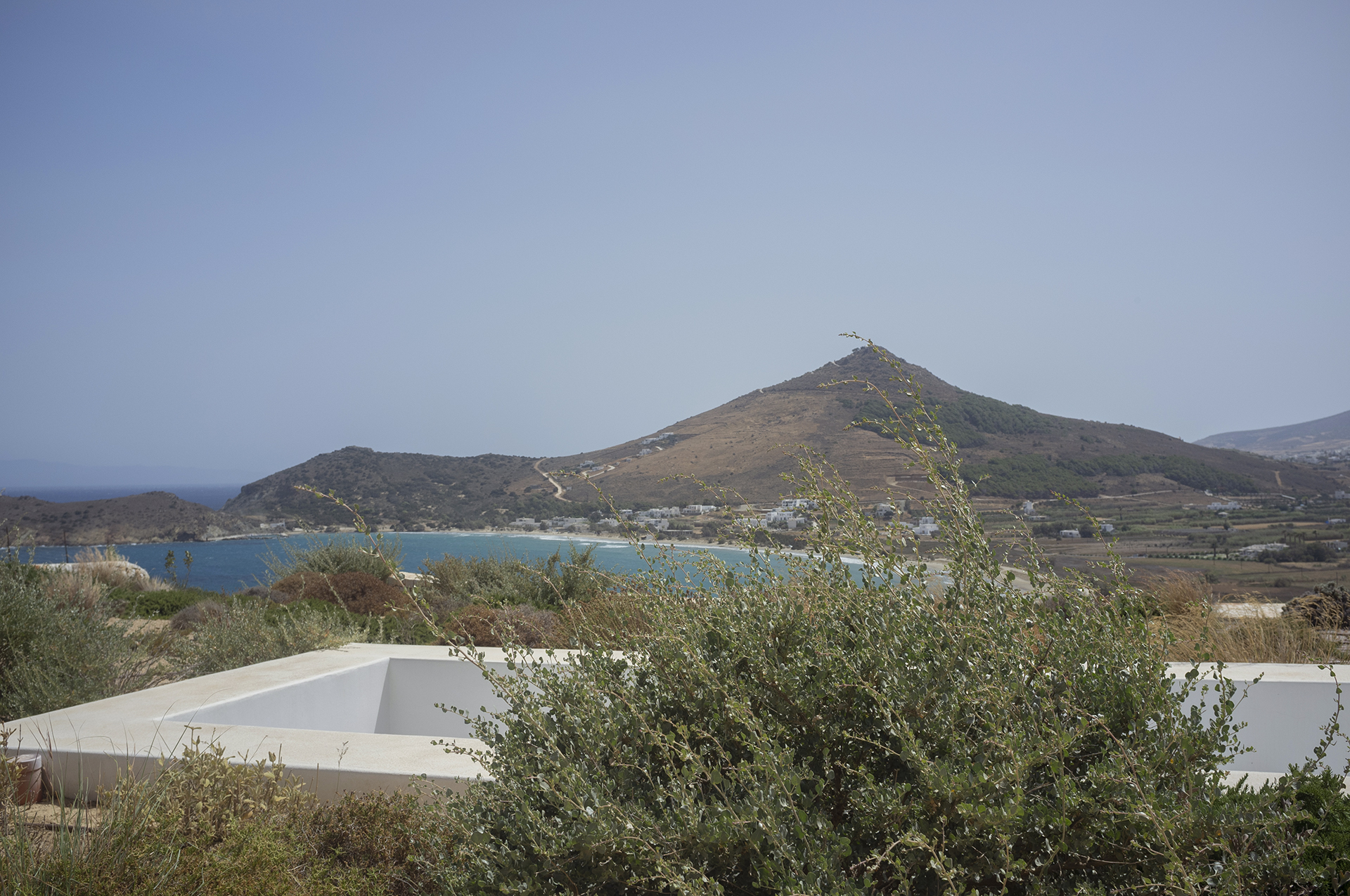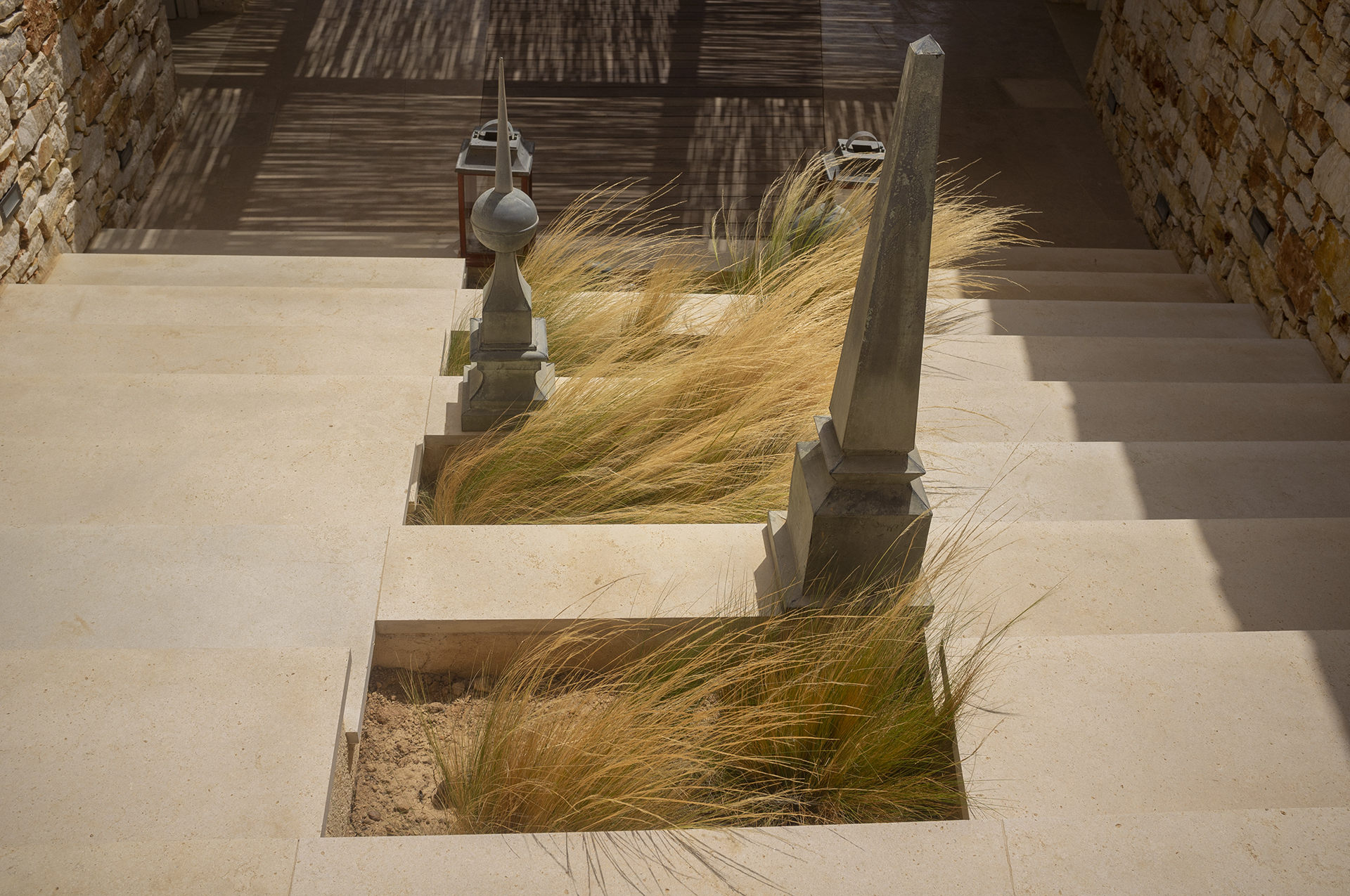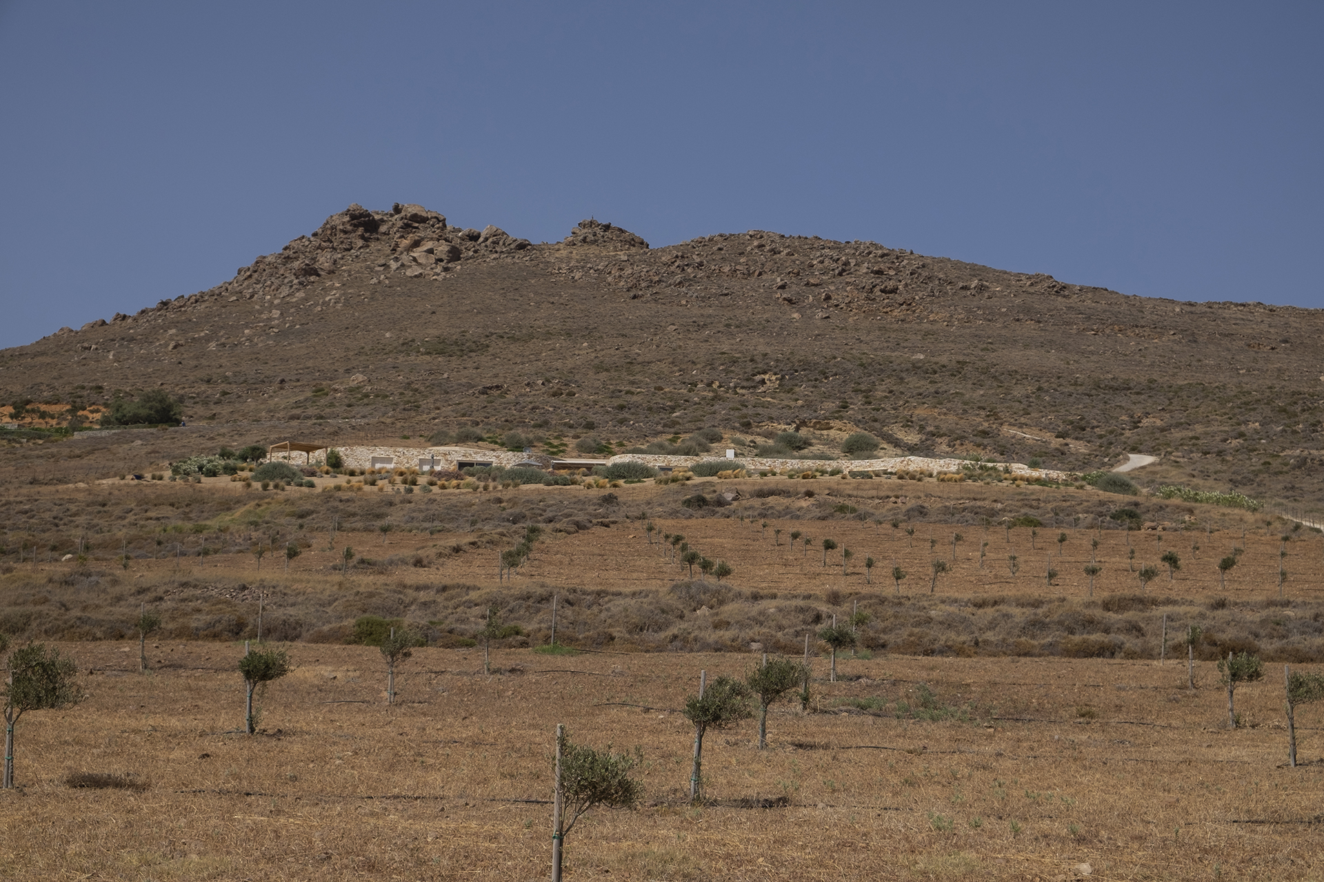Our goal was to create a garden that embraces the site’s natural topography and panoramic sea views. Set behind a large olive grove, it features clusters of native, drought-tolerant plants that are well-adapted to Paros’ climatic conditions. A key design element is the planted strips – integrated into the outdoor stairs of the house – where Stipa tenuissima grasses add texture and a sense of movement, while also blending with the palette of hardscape materials. Green roofs planted with low Mediterranean aromatics, perennials and grasses help to further integrate the residence into the natural landscape of Molos and improve the microclimatic conditions of the house.