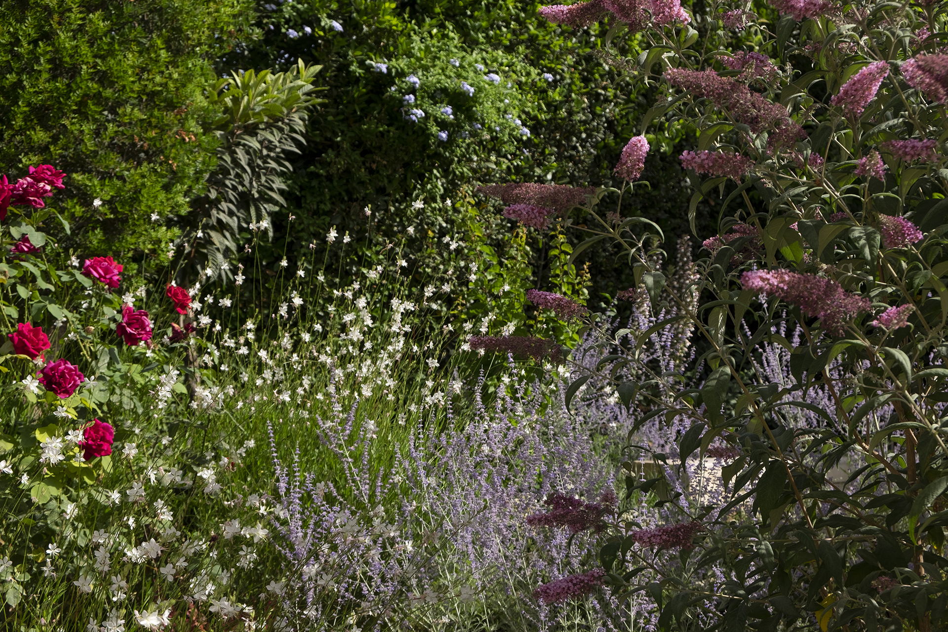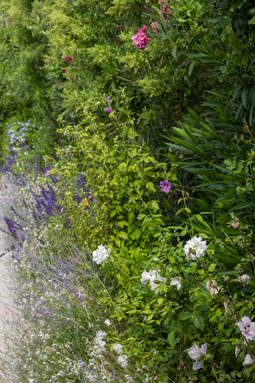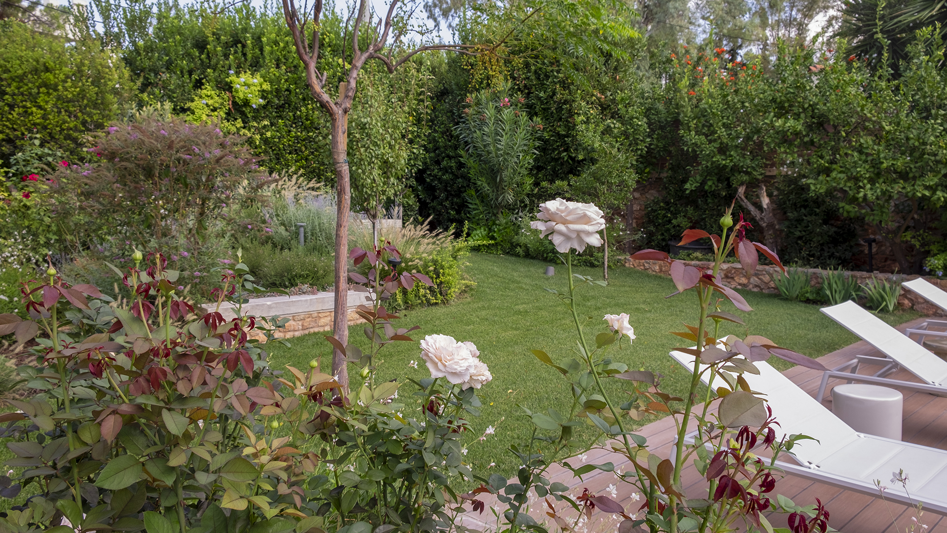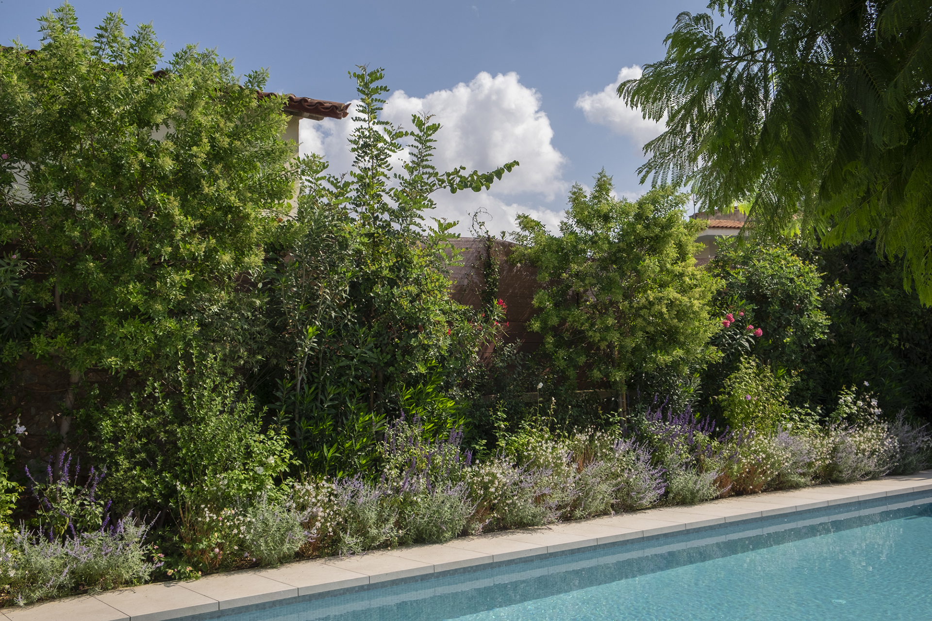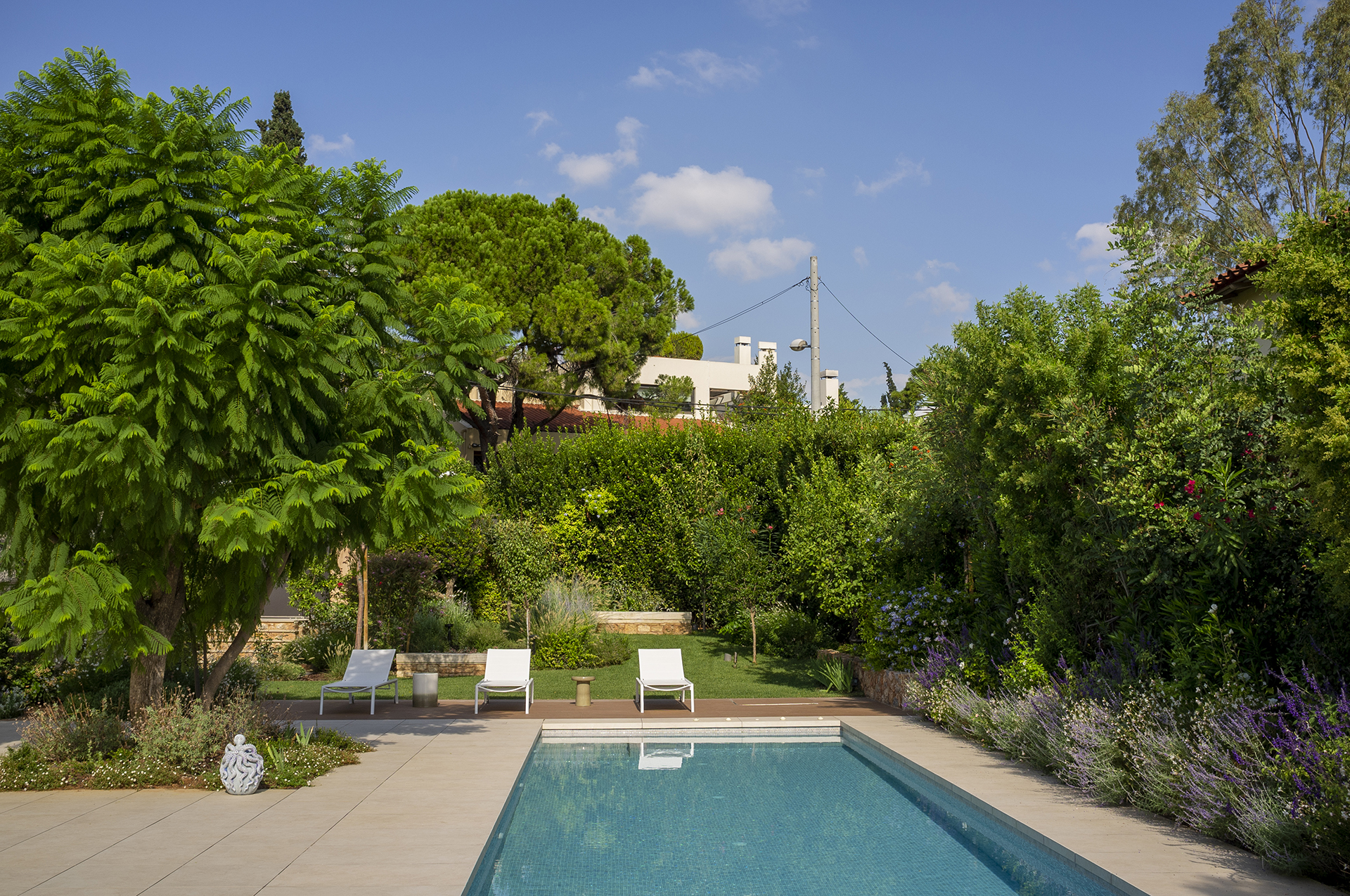 This garden in Paleo Psychiko consists of diverse flowering species that create a vibrant display of colors as they bloom in different seasons throughout the year. Special emphasis has been placed on roses, which serve as a focal point within the garden. The combination of lawn, aromatic plants, and ornamental grasses at the entrance is carefully designed to provide a welcoming and elegant environment for the residents. A mix of perennials and flowering shrubs -including Salvia farinacea, Gaura lindheimeri alba and Perovskia abrotanoides– has been planted along the pool, adding color and a sense of movement to the garden. A layer of trees and tall shrubs borders the garden, forming a lush green enclosure that offers privacy from the adjacent houses.