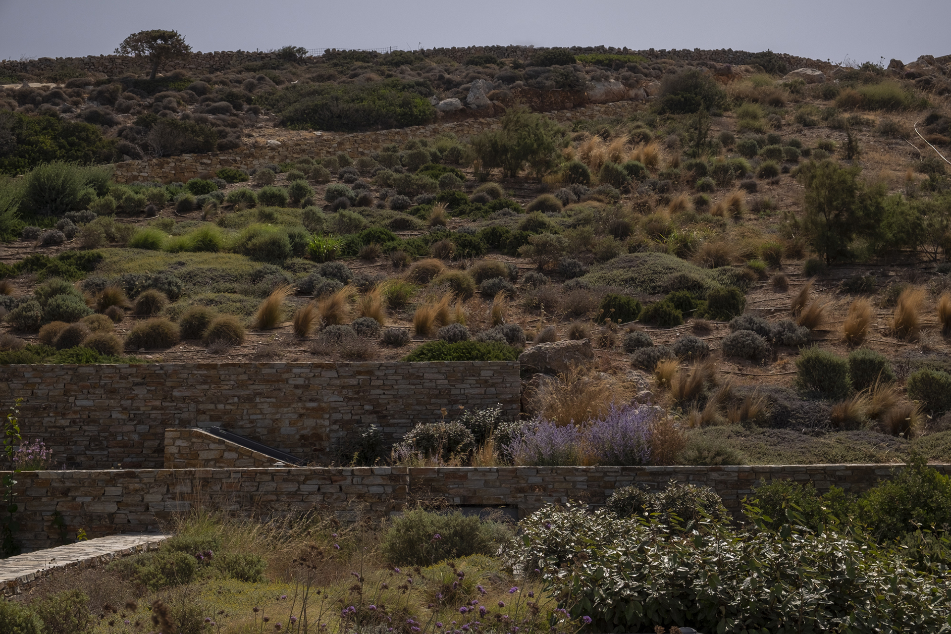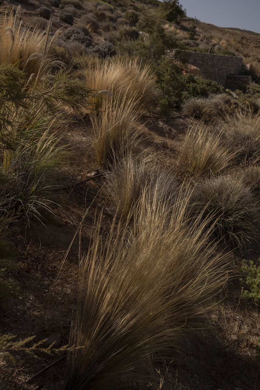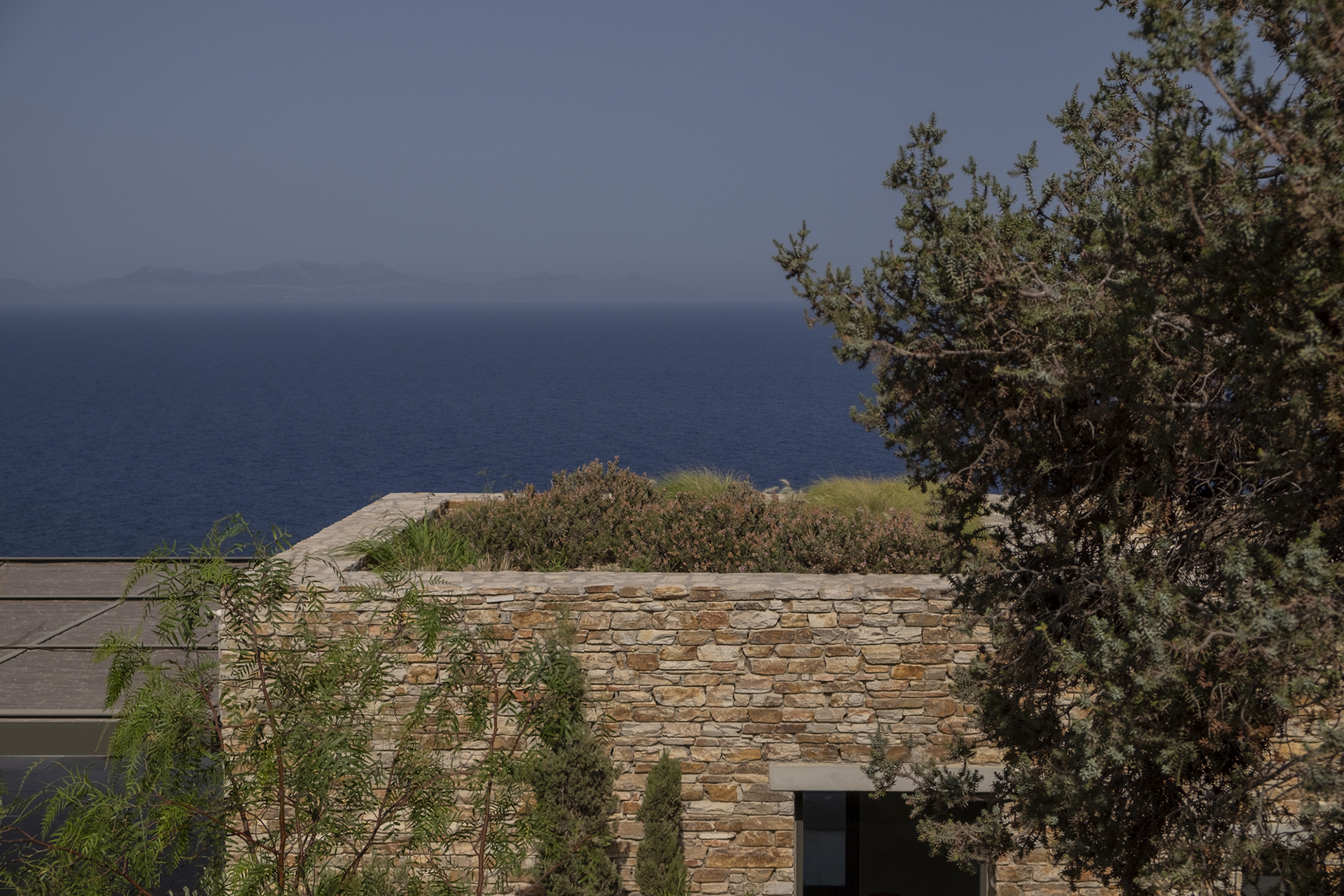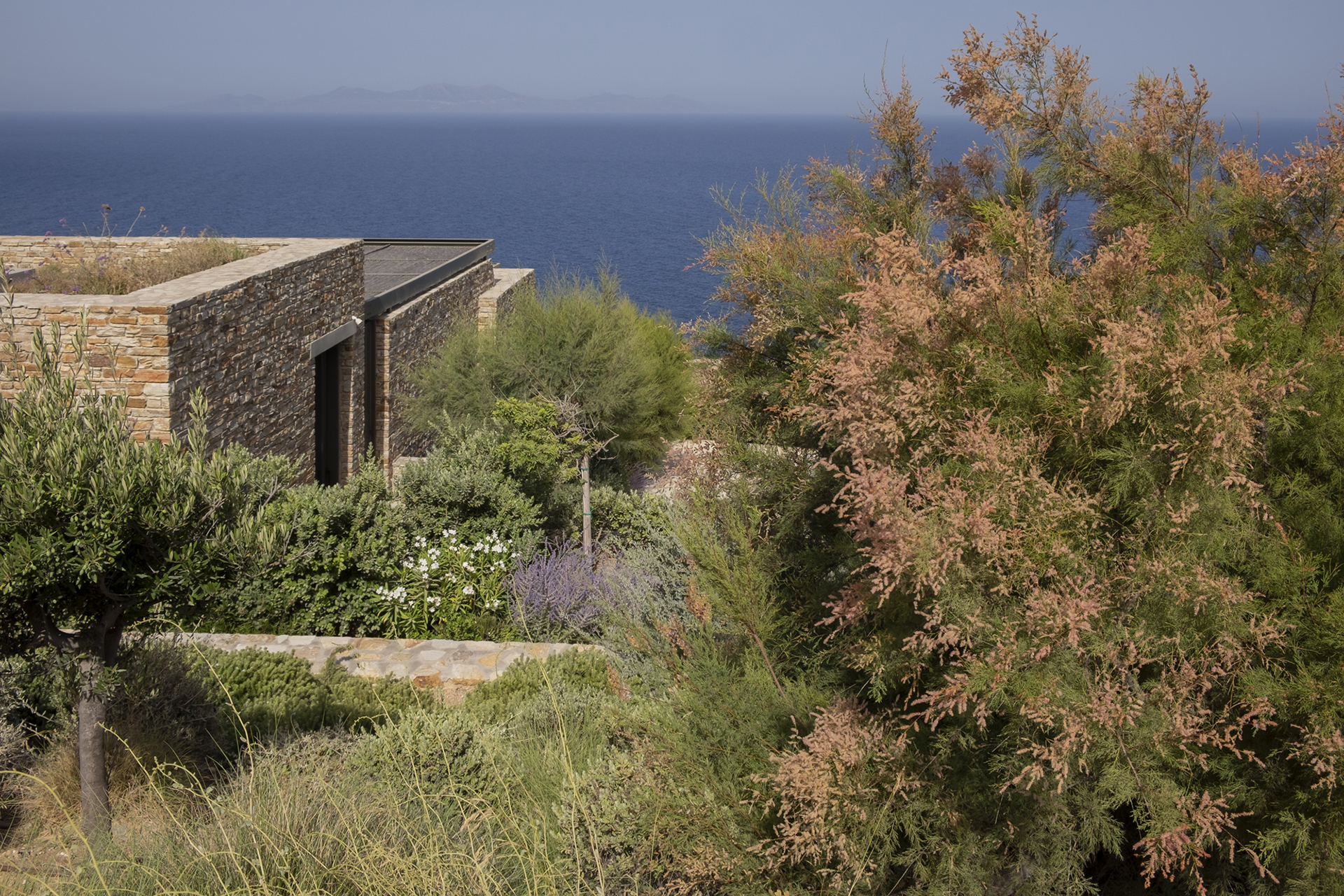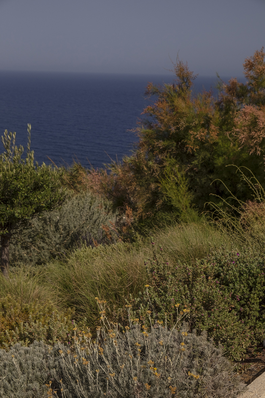 Our main goal was to create a design that would be consistent with the character of the existing landscape. Evergreen trees (Olea europaea, Ficus carica, Tamarix parviflora and Juniperus oxycedrus), ornamental grasses (Andropogon gerardii, Oryzopsis miliacea), and local aromatic plants were arranged in clusters, as one would encounter them in nature. The pool area was planted with native evergreen shrubs (Limoniastrum monopetalum, Nerium oleander, and Atriplex halimus) that harmonize beautifully with the Mediterranean landscape and complement the panoramic sea-view of the house. The stone pathways were lined with flowering perennials (Leucophyllum frutescens, Gaura lindheimeri ‘Alba’, Teucrium fruticans, Teucrium brevifolium, Perovskia abrotanoides, Phlomis fruticosa, Salvia ‘Allen Chickering’, a.o.) and herbs (Origanum vulgare, Thymus capitatus, Thymus vulgaris, Rosmarinus officialis ‘Postratus’, a.o.), and the green roofs were covered with grasses (Juncus maritimus, Arundo donax) and perennials (Salvia chamaedroides, Carissa grandiflora, Helichrysum italicum, Helichrysum petiolare, a.o.) that enhance the microclimate of the building and the biodiversity of the site, contributing to a sustainable, eco-friendly environment.