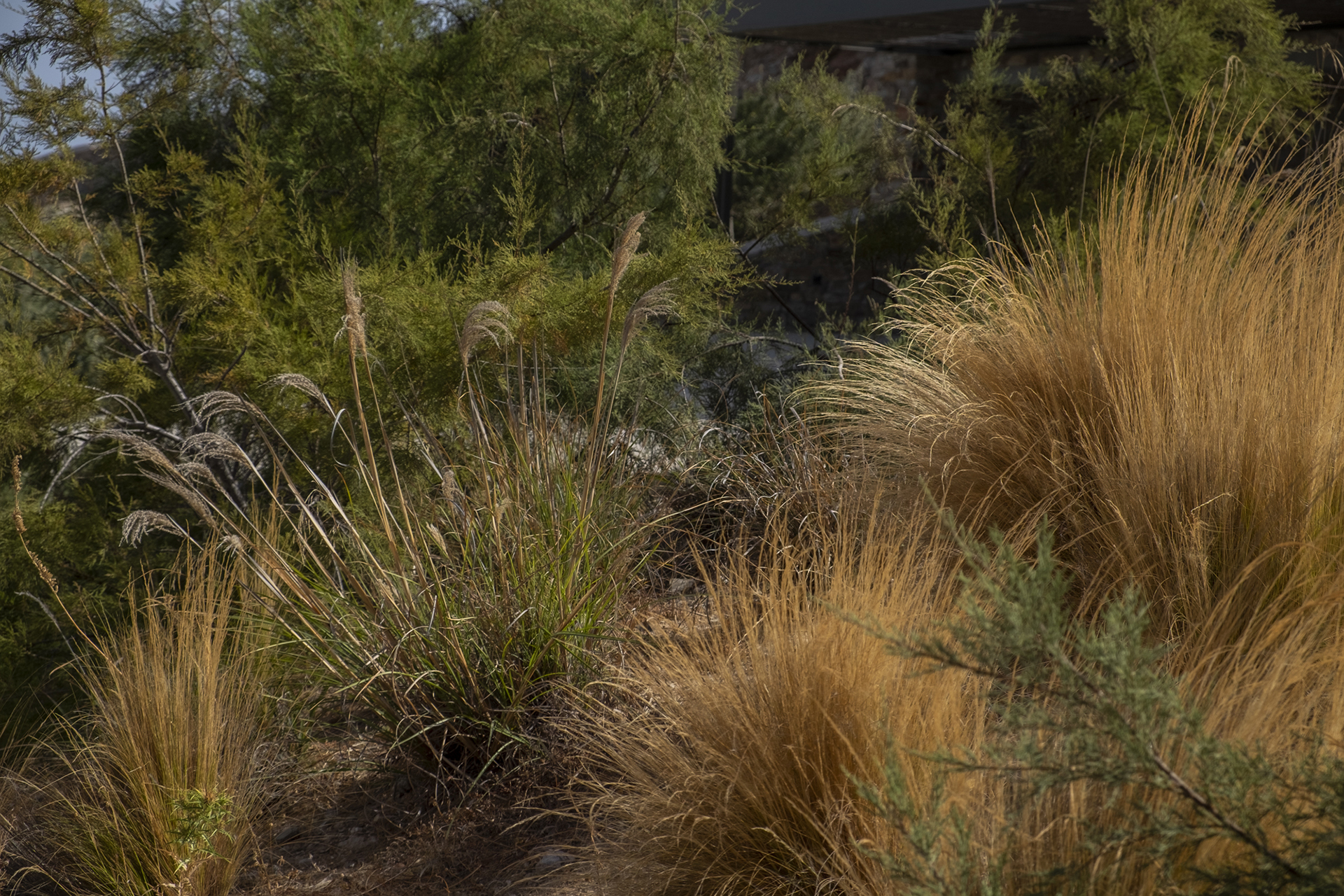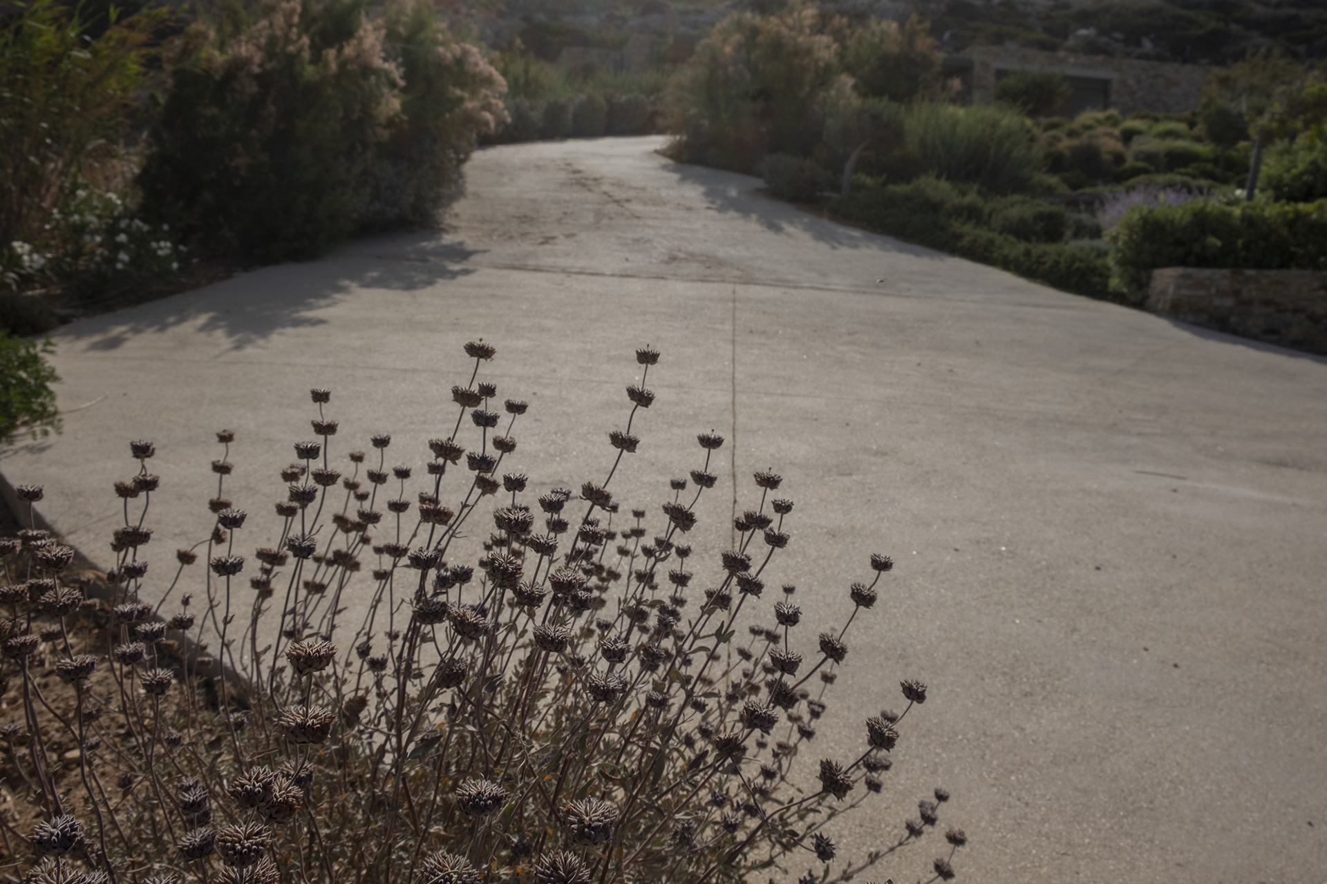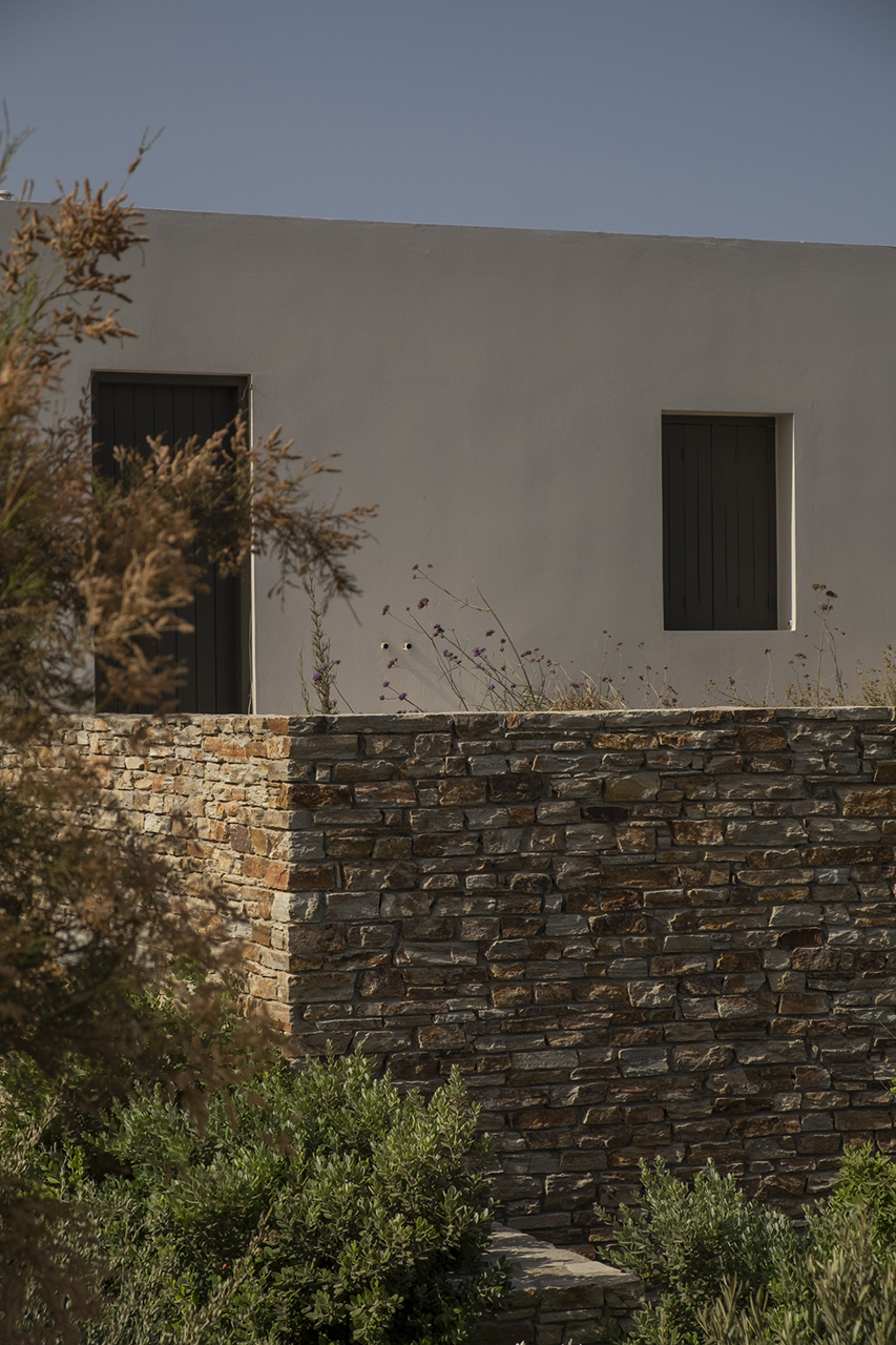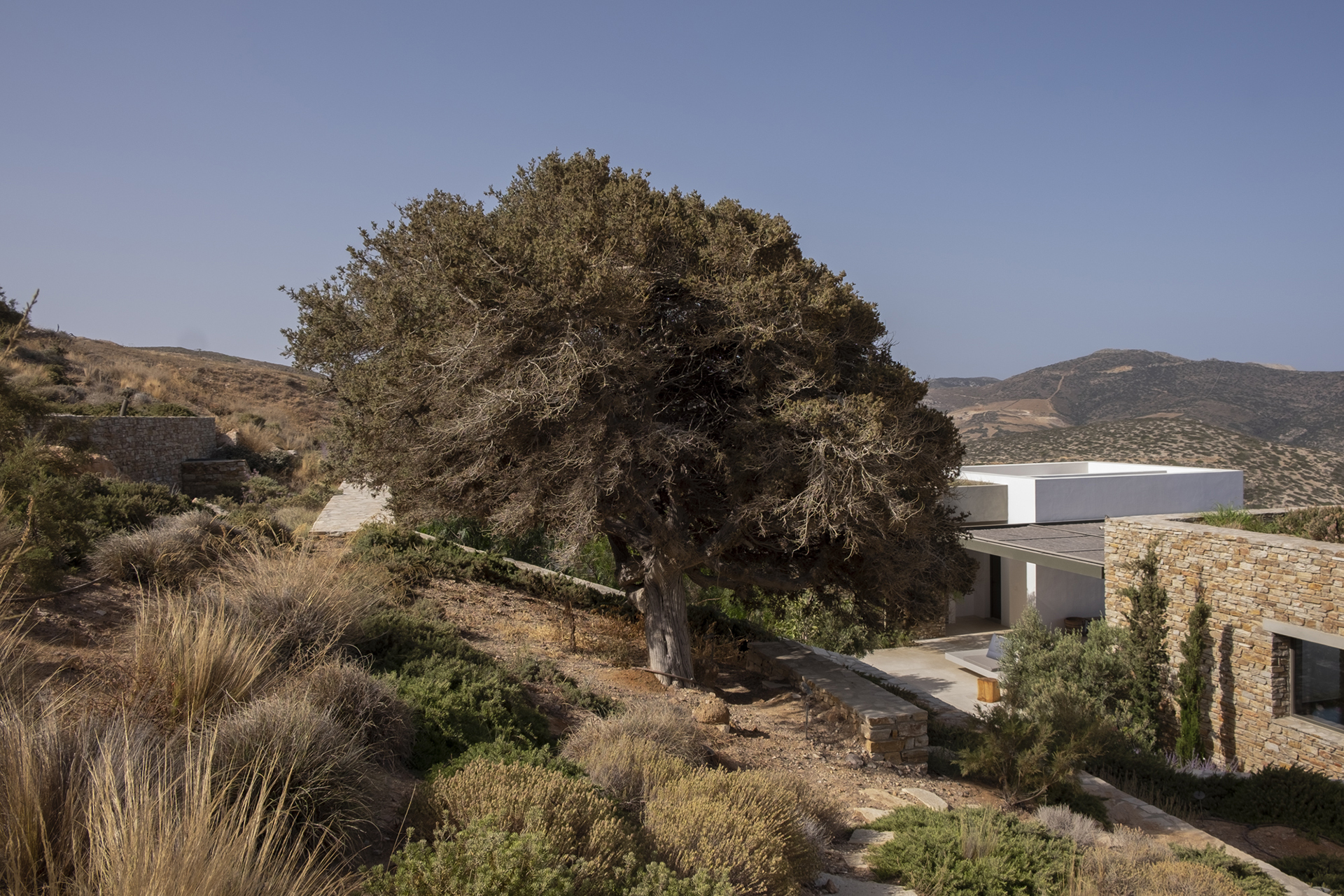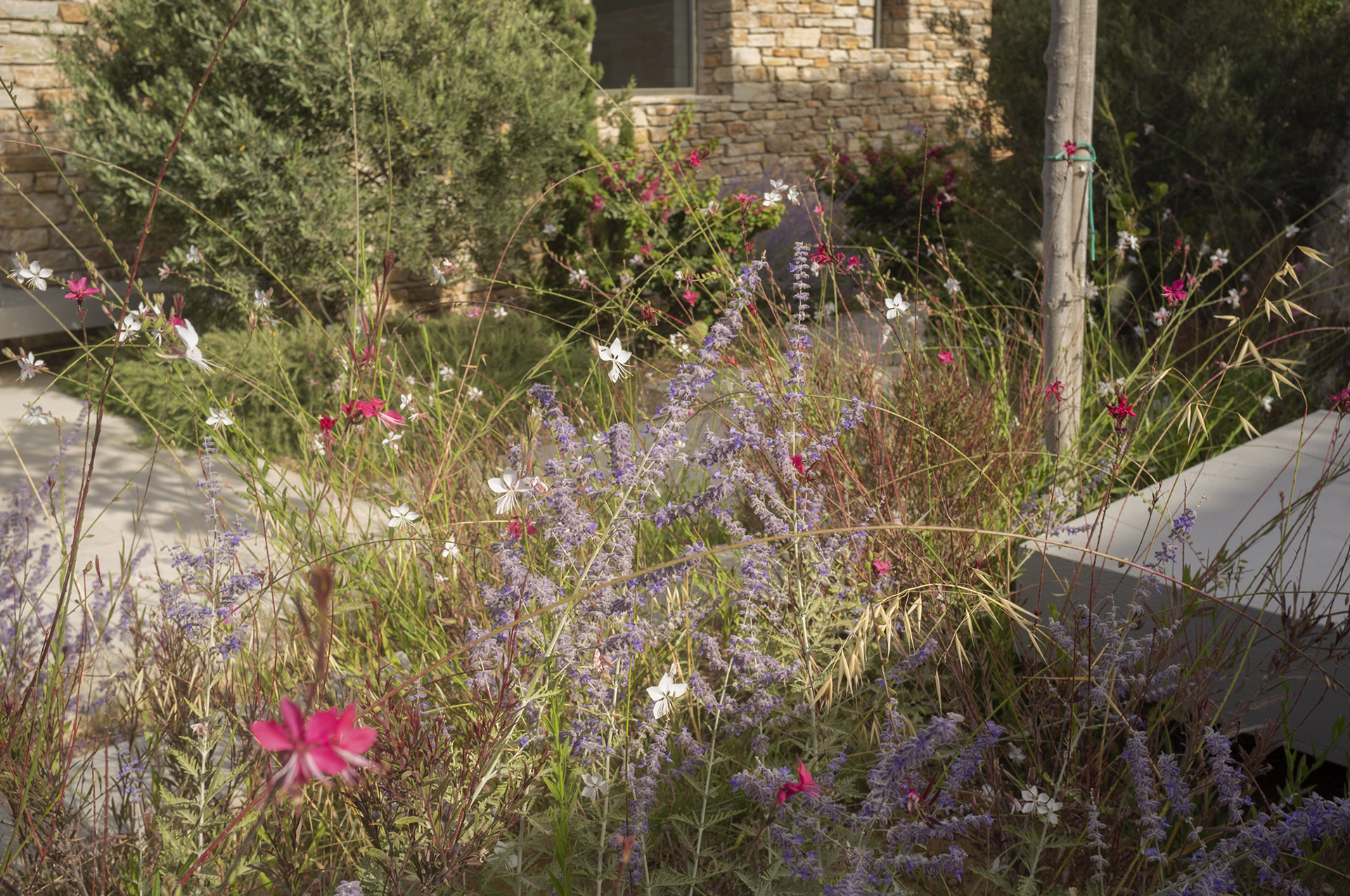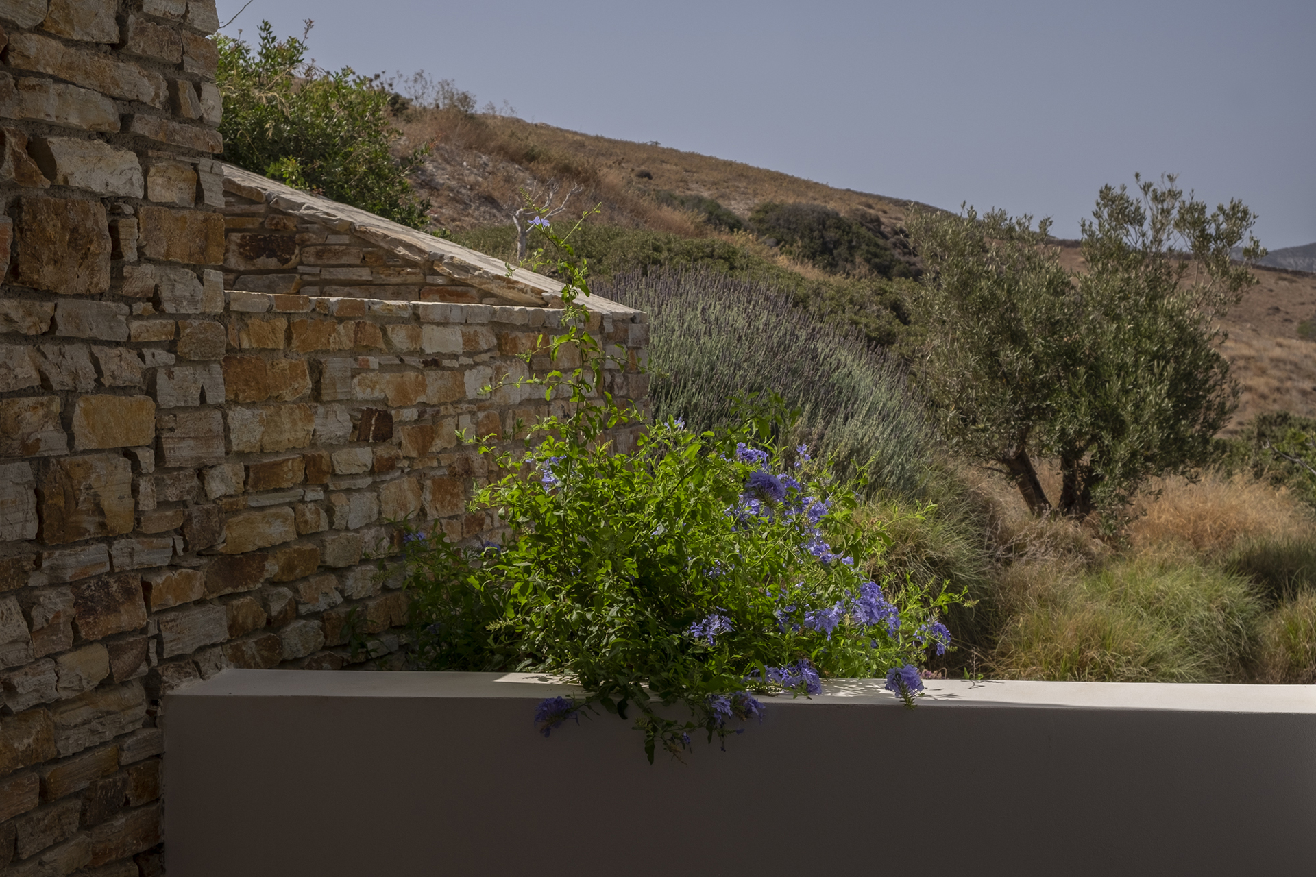 Our main goal was to create a design that would be consistent with the character of the existing landscape. Evergreen trees (Olea europaea, Ficus carica, Tamarix parviflora and Juniperus oxycedrus), ornamental grasses (Andropogon gerardii, Oryzopsis miliacea), and local aromatic plants were arranged in clusters, as one would encounter them in nature. The pool area was planted with native evergreen shrubs (Limoniastrum monopetalum, Nerium oleander, and Atriplex halimus) that harmonize beautifully with the Mediterranean landscape and complement the panoramic sea-view of the house. The stone pathways were lined with flowering perennials (Leucophyllum frutescens, Gaura lindheimeri ‘Alba’, Teucrium fruticans, Teucrium brevifolium, Perovskia abrotanoides, Phlomis fruticosa, Salvia ‘Allen Chickering’, a.o.) and herbs (Origanum vulgare, Thymus capitatus, Thymus vulgaris, Rosmarinus officialis ‘Postratus’, a.o.), and the green roofs were covered with grasses (Juncus maritimus, Arundo donax) and perennials (Salvia chamaedroides, Carissa grandiflora, Helichrysum italicum, Helichrysum petiolare, a.o.) that enhance the microclimate of the building and the biodiversity of the site, contributing to a sustainable, eco-friendly environment.