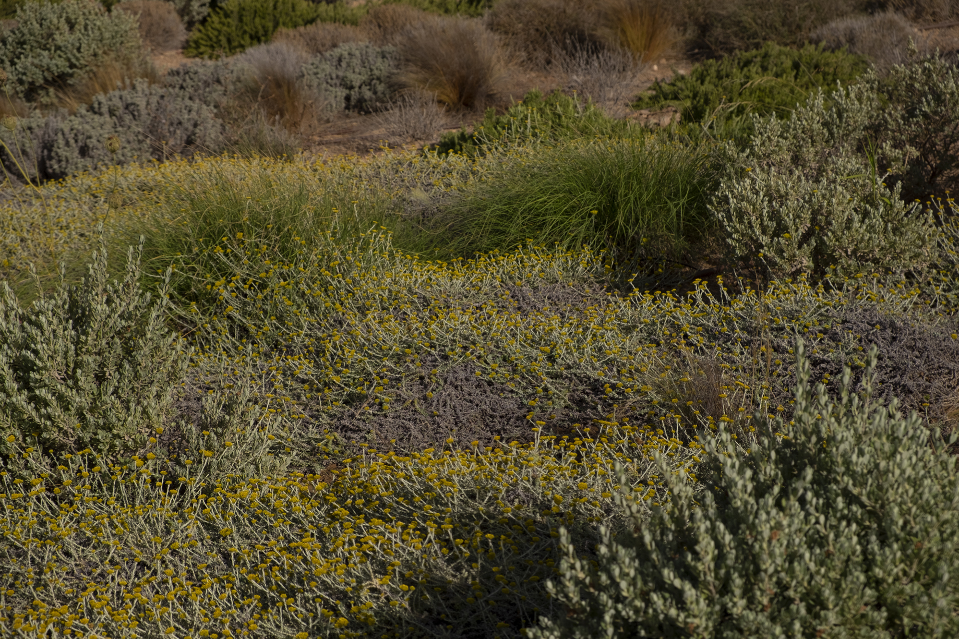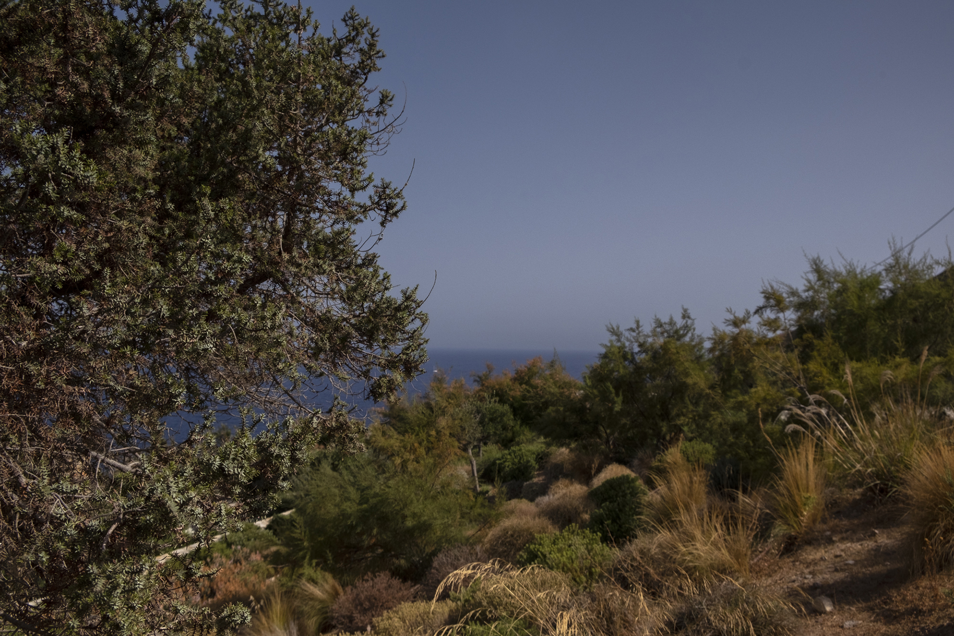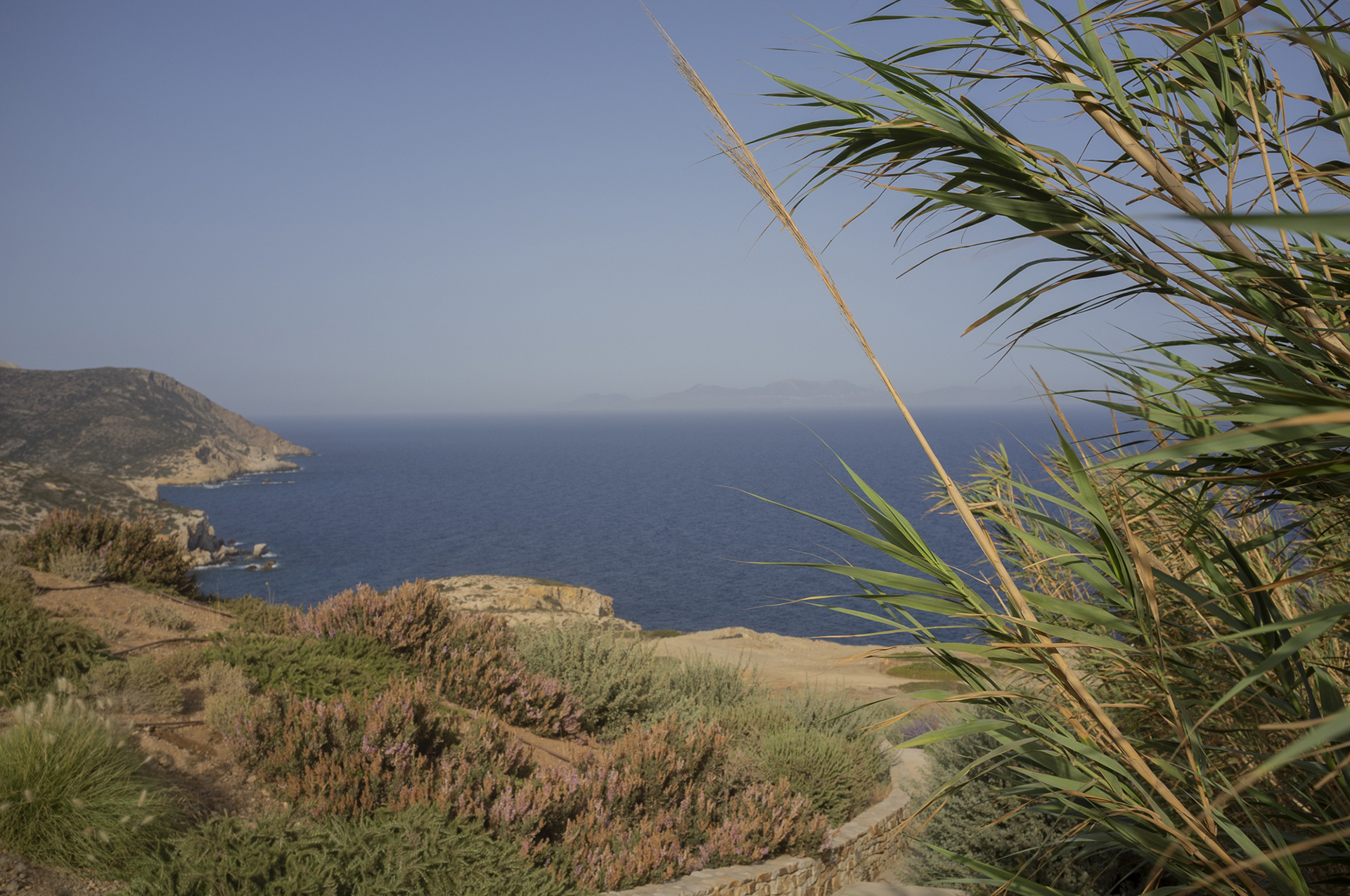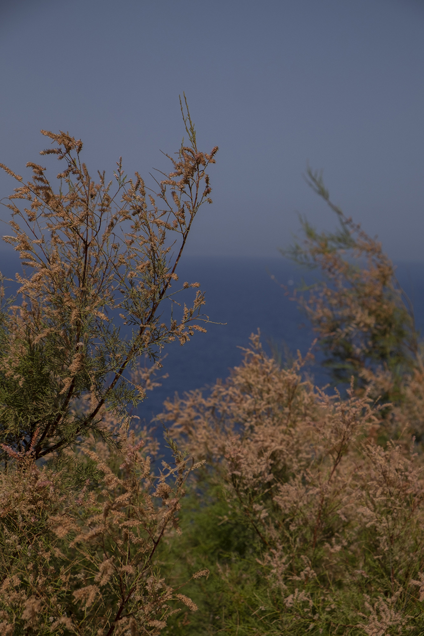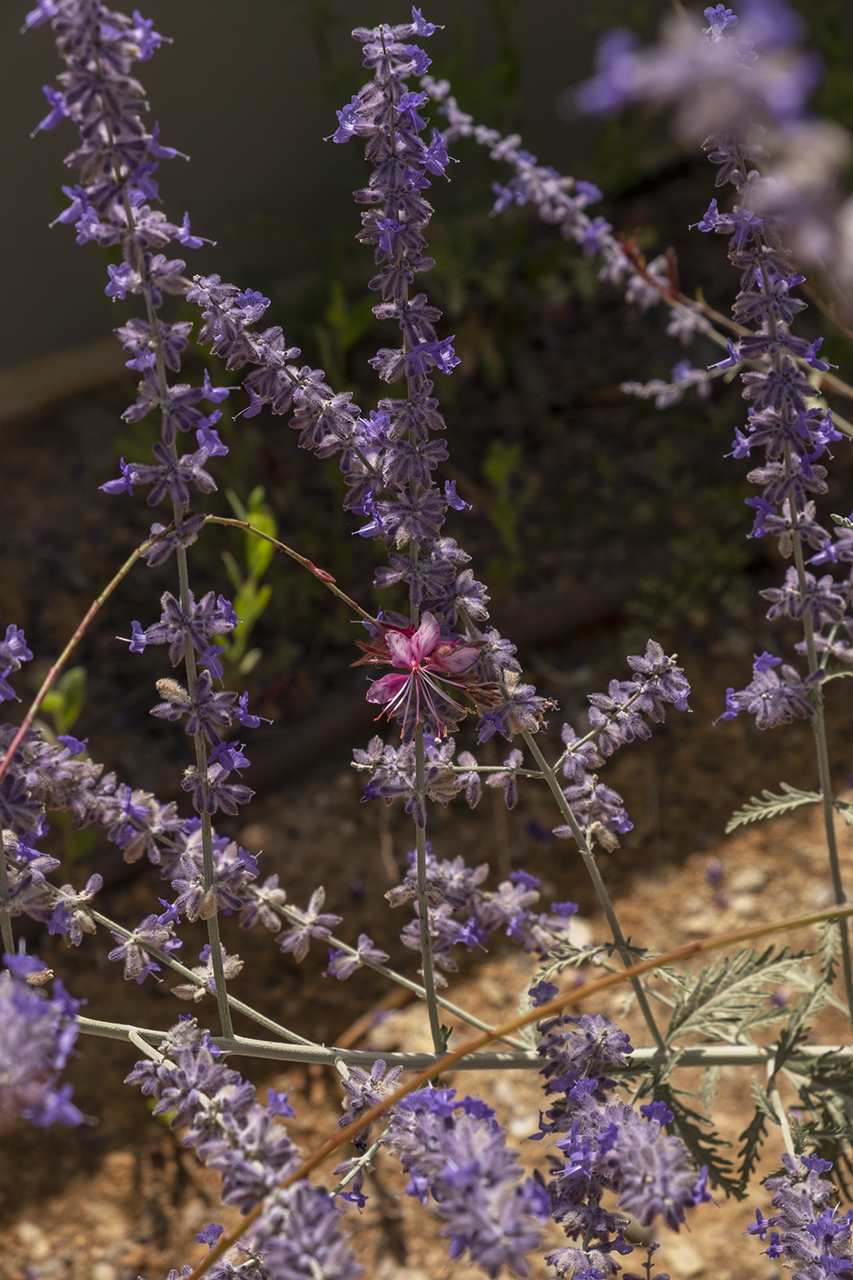 Our main goal was to create a design that would be consistent with the character of the existing landscape. Evergreen trees (Olea europaea, Ficus carica, Tamarix parviflora and Juniperus oxycedrus), ornamental grasses (Andropogon gerardii, Oryzopsis miliacea), and local aromatic plants were arranged in clusters, as one would encounter them in nature. The pool area was planted with native evergreen shrubs (Limoniastrum monopetalum, Nerium oleander, and Atriplex halimus) that harmonize beautifully with the Mediterranean landscape and complement the panoramic sea-view of the house. The stone pathways were lined with flowering perennials (Leucophyllum frutescens, Gaura lindheimeri ‘Alba’, Teucrium fruticans, Teucrium brevifolium, Perovskia abrotanoides, Phlomis fruticosa, Salvia ‘Allen Chickering’, a.o.) and herbs (Origanum vulgare, Thymus capitatus, Thymus vulgaris, Rosmarinus officialis ‘Postratus’, a.o.), and the green roofs were covered with grasses (Juncus maritimus, Arundo donax) and perennials (Salvia chamaedroides, Carissa grandiflora, Helichrysum italicum, Helichrysum petiolare, a.o.) that enhance the microclimate of the building and the biodiversity of the site, contributing to a sustainable, eco-friendly environment.