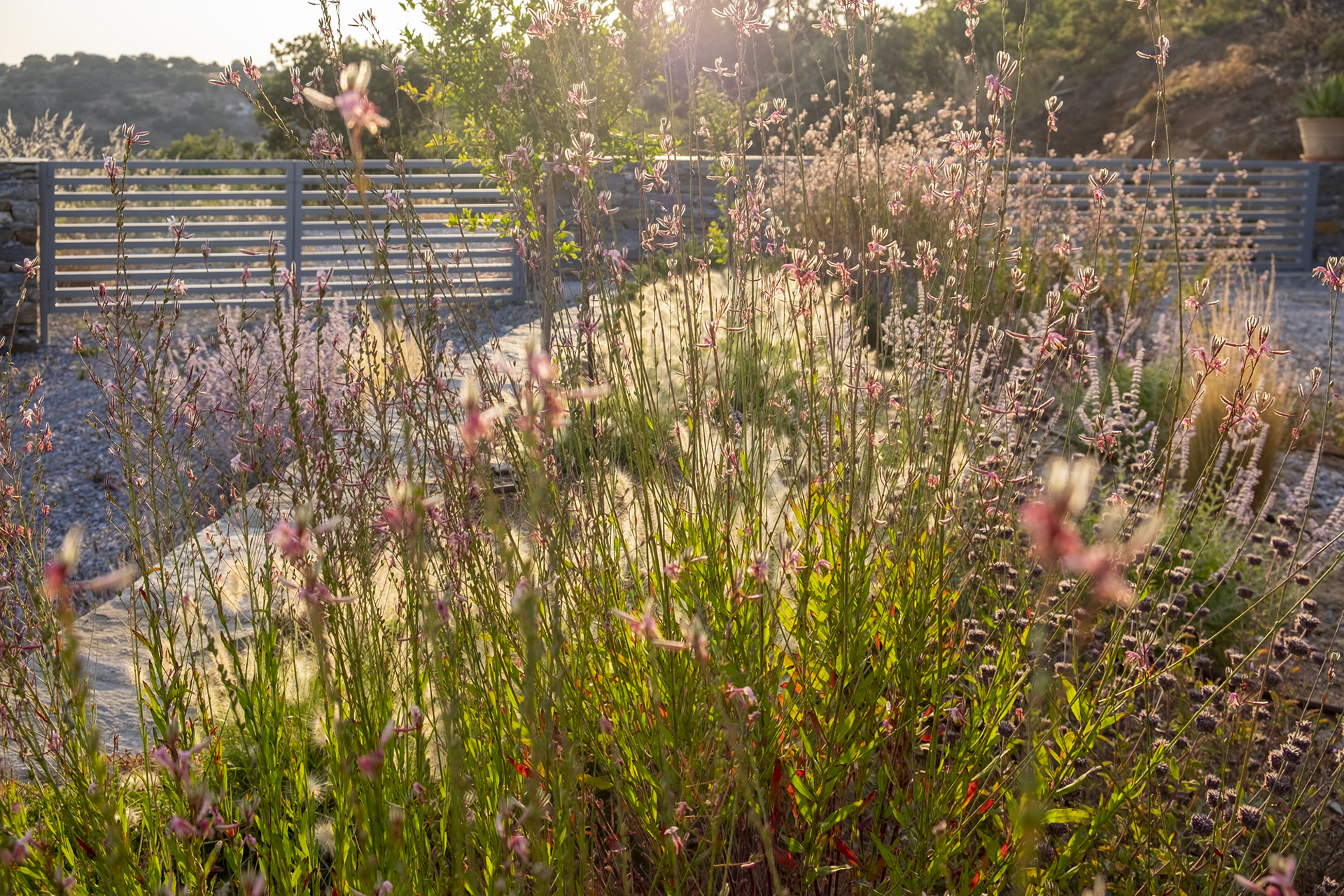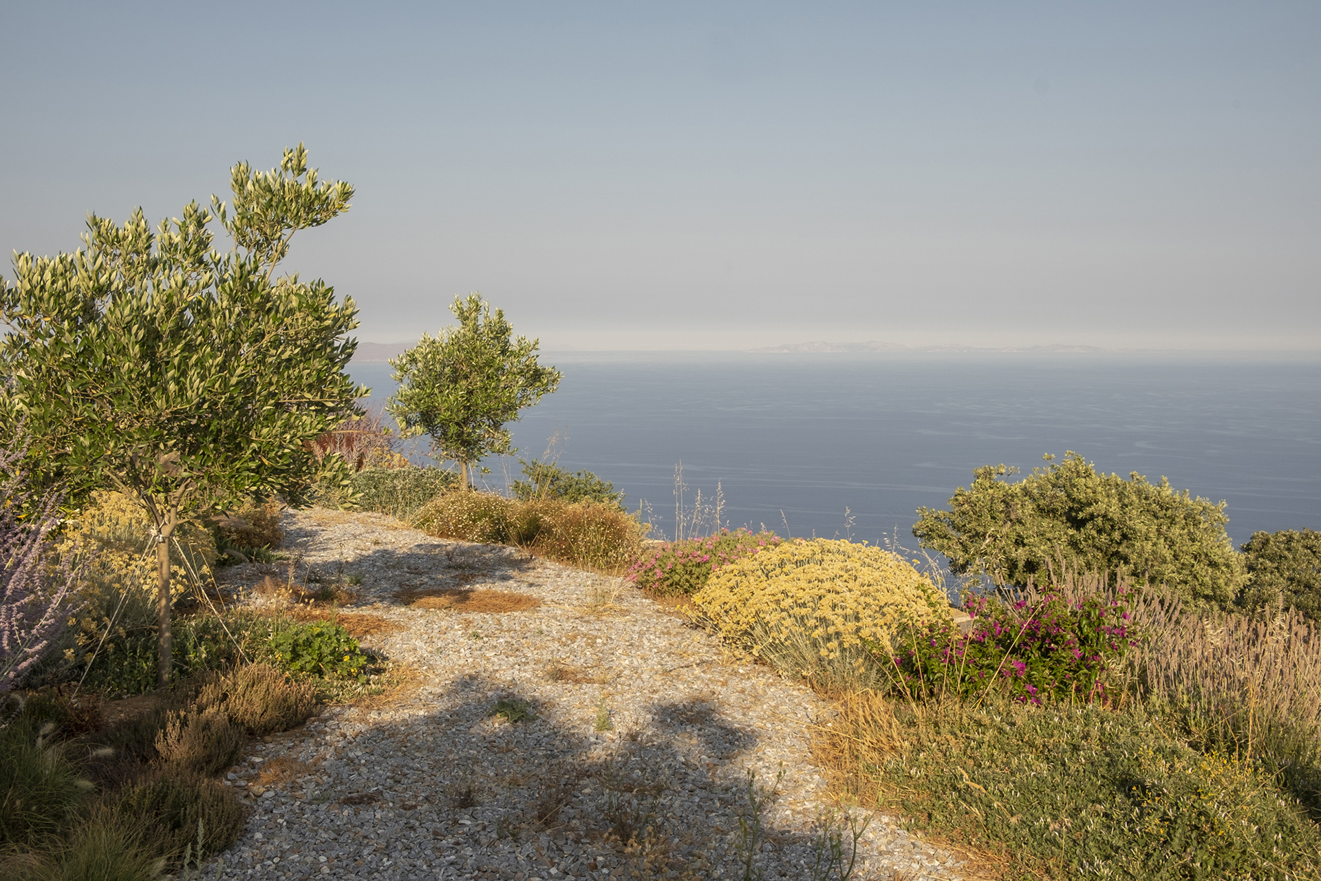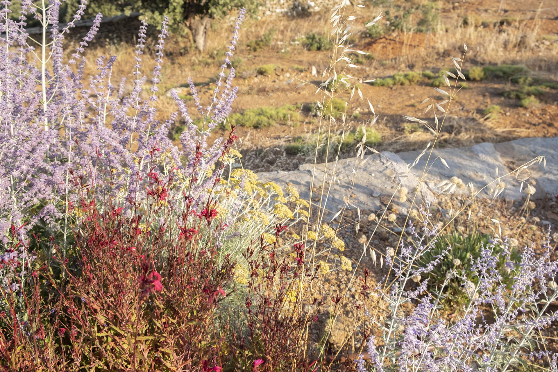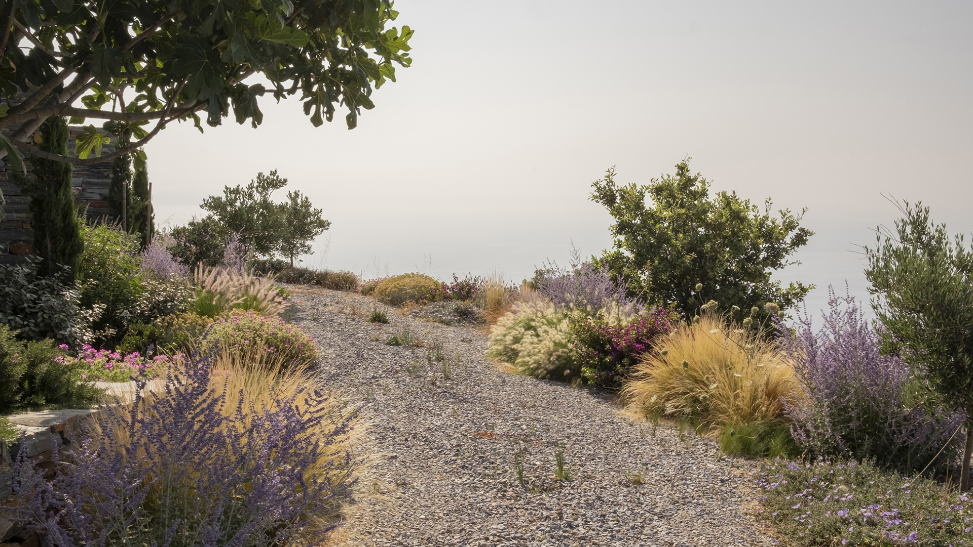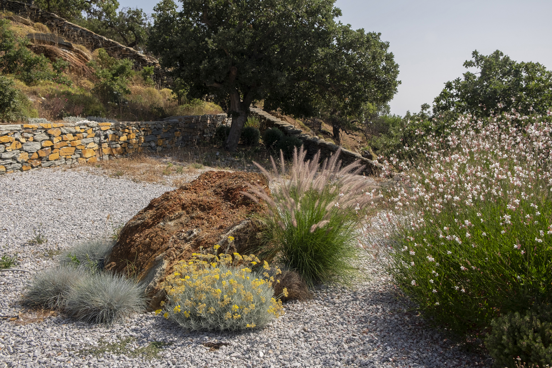 The focus of this project was to design a Mediterranean/Cycladic garden. The proposed plant species were specifically selected to blend with the island’s native flora, creating a seamless natural landscape. The gravel pathways linking the various outdoor areas to the house are edged by clusters of herbs and flowering perennials that fill the air with fragrance and colors. The garden features decorative rocks, groups of grasses, and perennial herbaceous plants that add texture and a sculptural quality to the end result. Tall Mediterranean cypresses frame the panoramic views of the house, enhancing the garden’s connection to the surrounding environment.