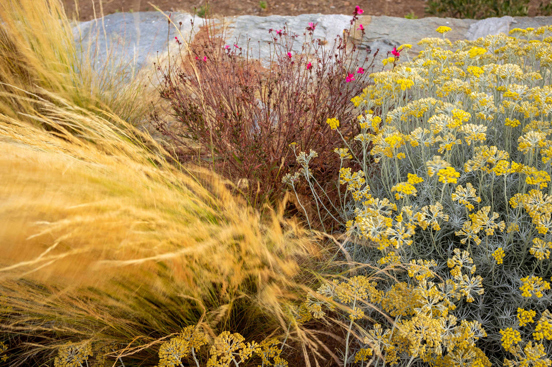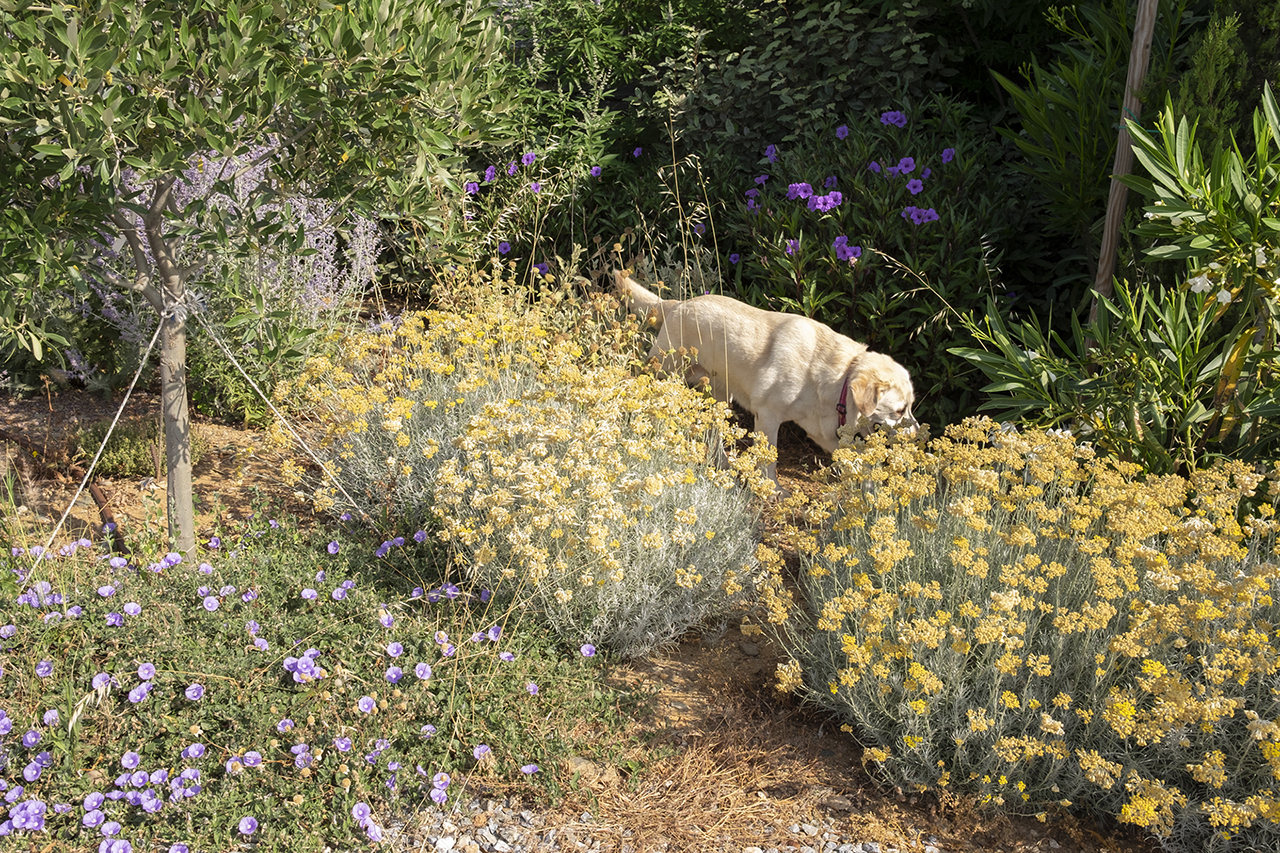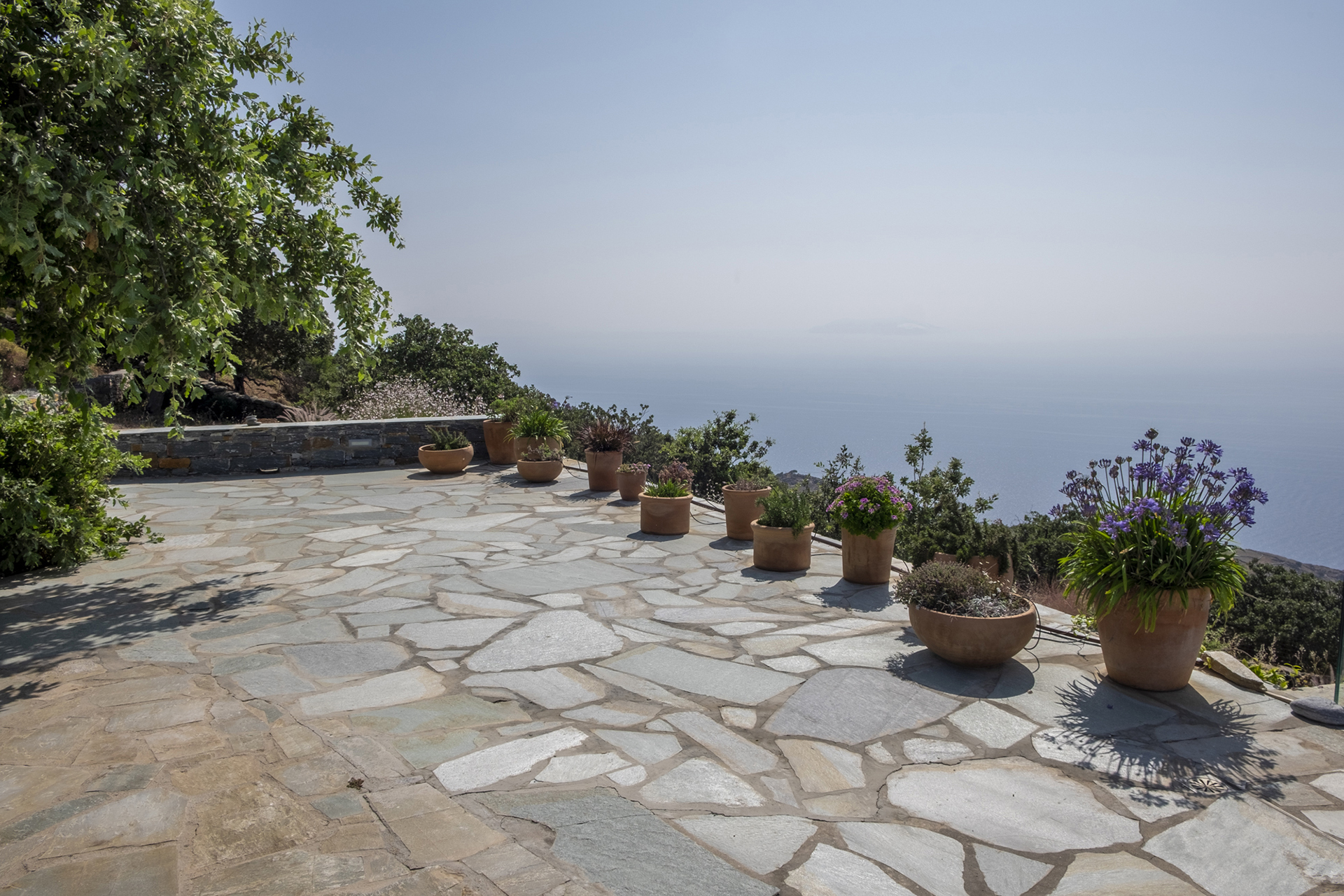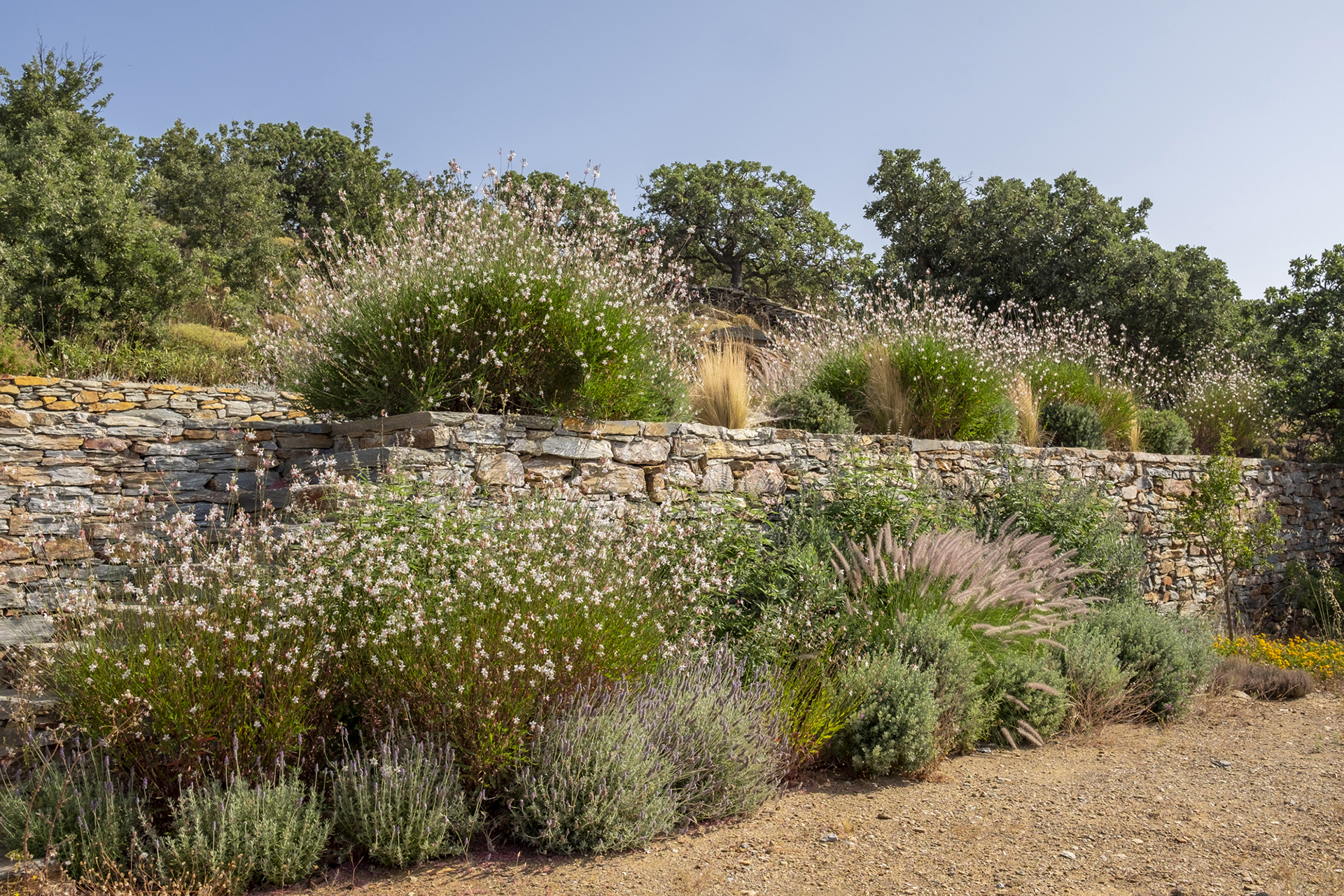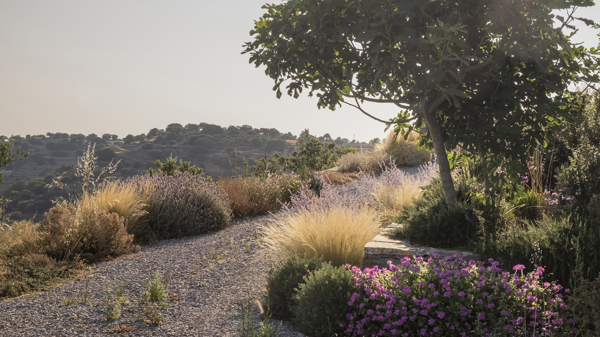 The focus of this project was to design a Mediterranean/Cycladic garden. The proposed plant species were specifically selected to blend with the island’s native flora, creating a seamless natural landscape. The gravel pathways linking the various outdoor areas to the house are edged by clusters of herbs and flowering perennials that fill the air with fragrance and colors. The garden features decorative rocks, groups of grasses, and perennial herbaceous plants that add texture and a sculptural quality to the end result. Tall Mediterranean cypresses frame the panoramic views of the house, enhancing the garden’s connection to the surrounding environment.